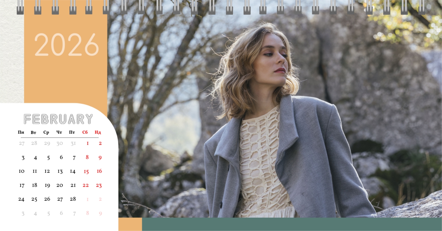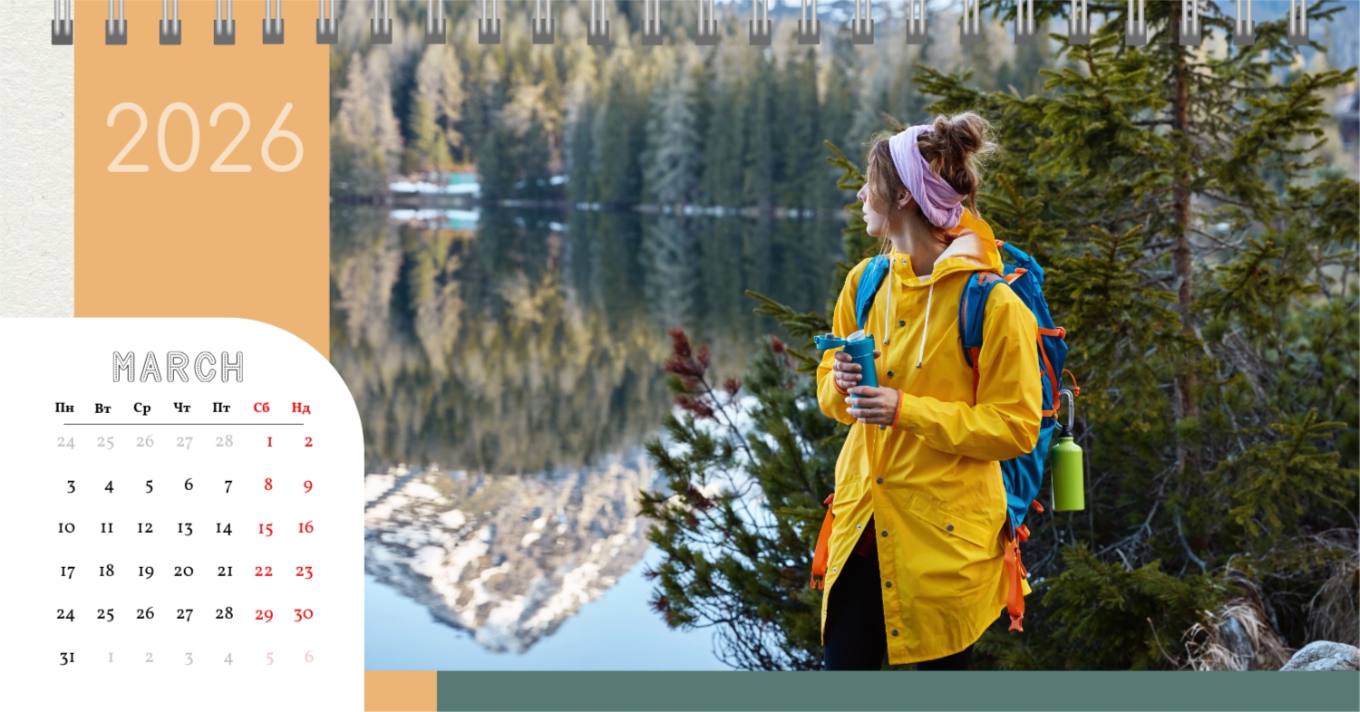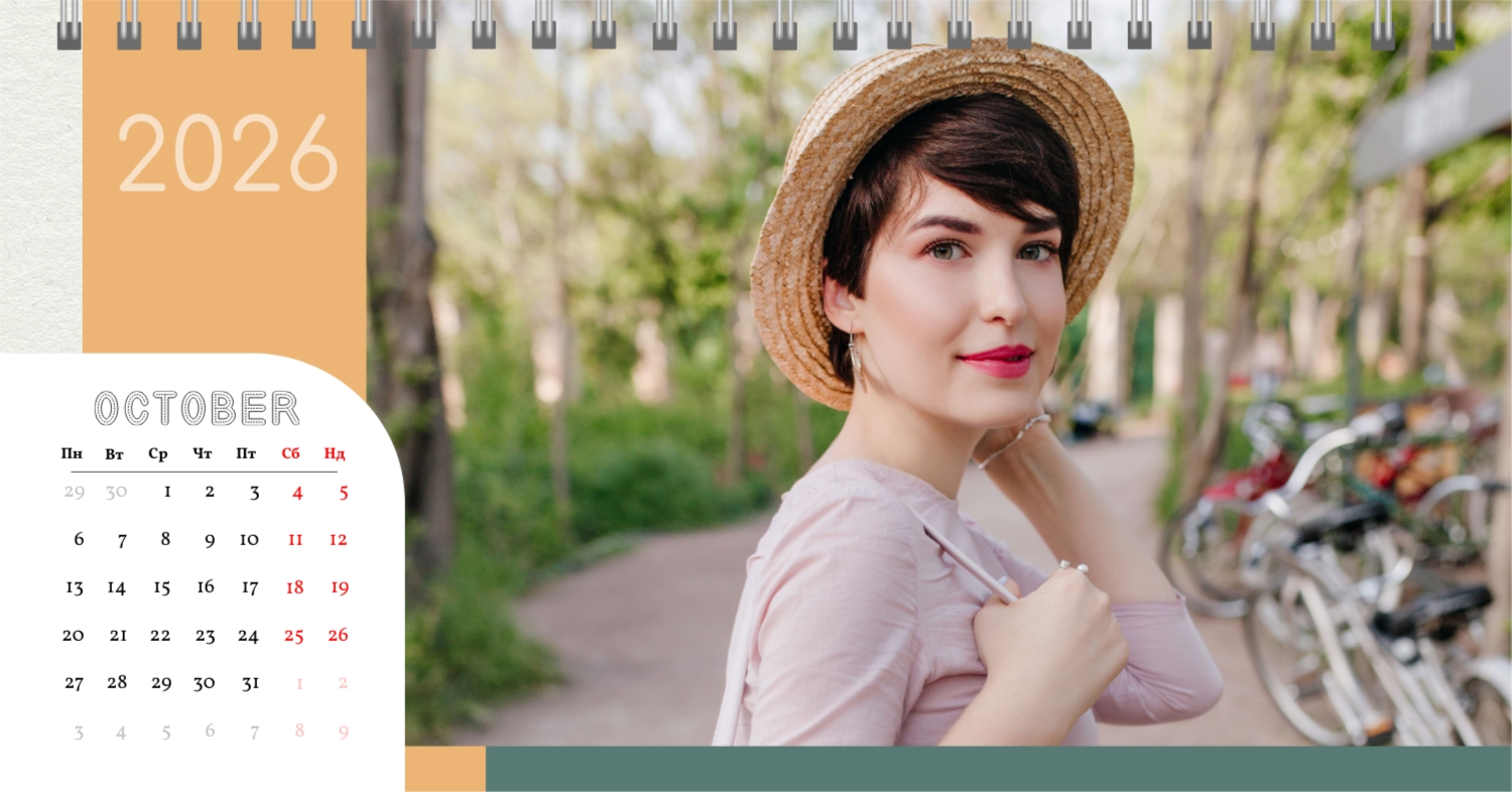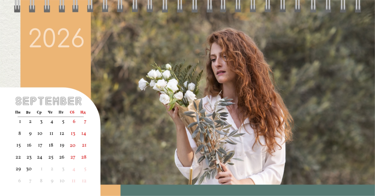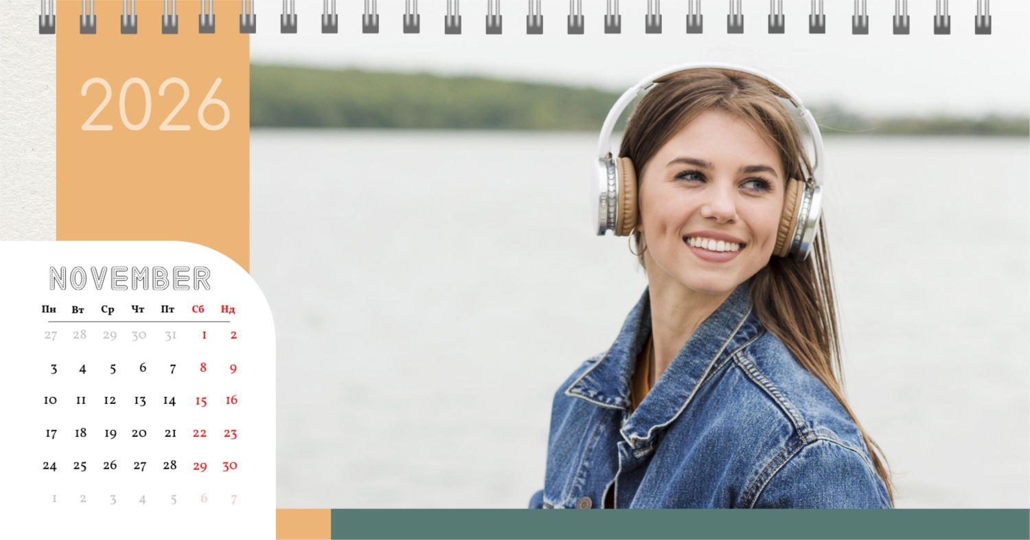 Цей чарівний шаблон настільного горизонтального календаря "кращі спогади" покликаний надихнути вас на створення унікального і ніжного календаря, повного теплих моментів Вашого життя. Онлайн-конструктор, доступний для Вас, надає дивовижні можливості для творчості. Ви зможете легко налаштувати кожну деталь, щоб зробити календар по-справжньому вашим. Використовуйте функцію додавання персональних фотографій, щоб ваші найкращі моменти були в центрі уваги. Широкий вибір кольорів і шрифтів в конструкторі дозволяє вам підкреслити атмосферу кожного місяця. Виберіть відтінки, які викликають у вас ті самі почуття, які ви хочете зберегти в пам'яті. Створення унікального настільного календаря в онлайн-конструкторі-це не тільки процес, але і можливість втілити в життя свої кращі спогади з особливою ніжністю і теплотою. Нехай цей календар стане відображенням вашої унікальної історії.