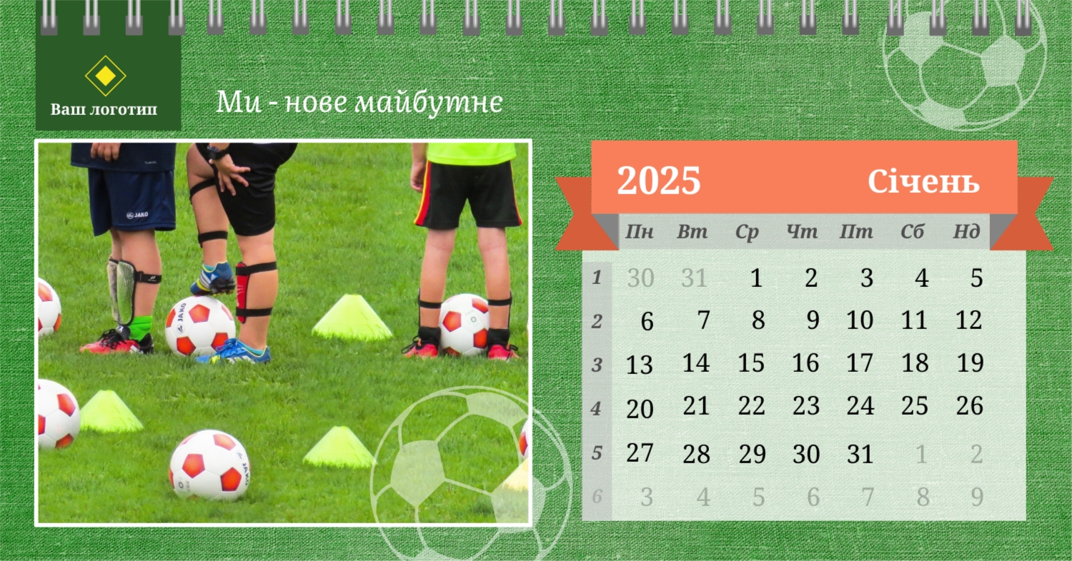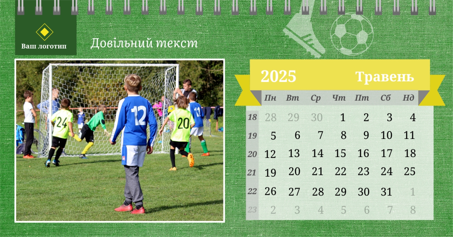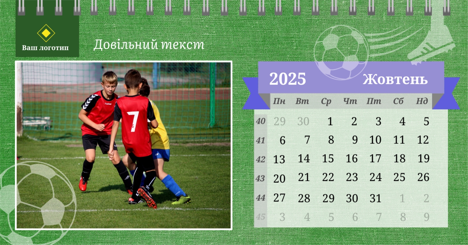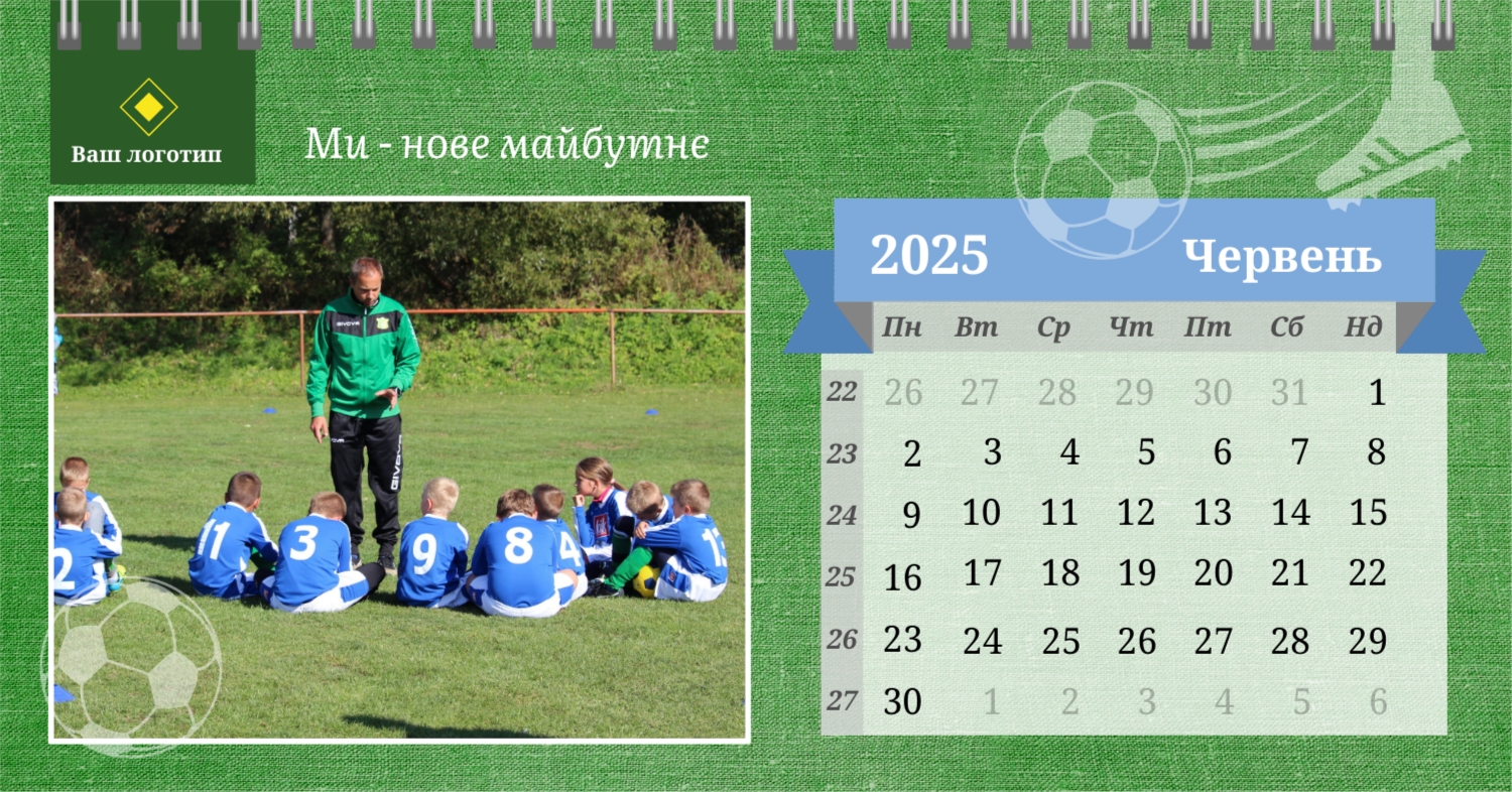Безкоштовний шаблон рекламного календаря-будиночка онлайн для футбольної школи, футбольного клубу. Створіть макет своїми руками в конструкторі календарів.