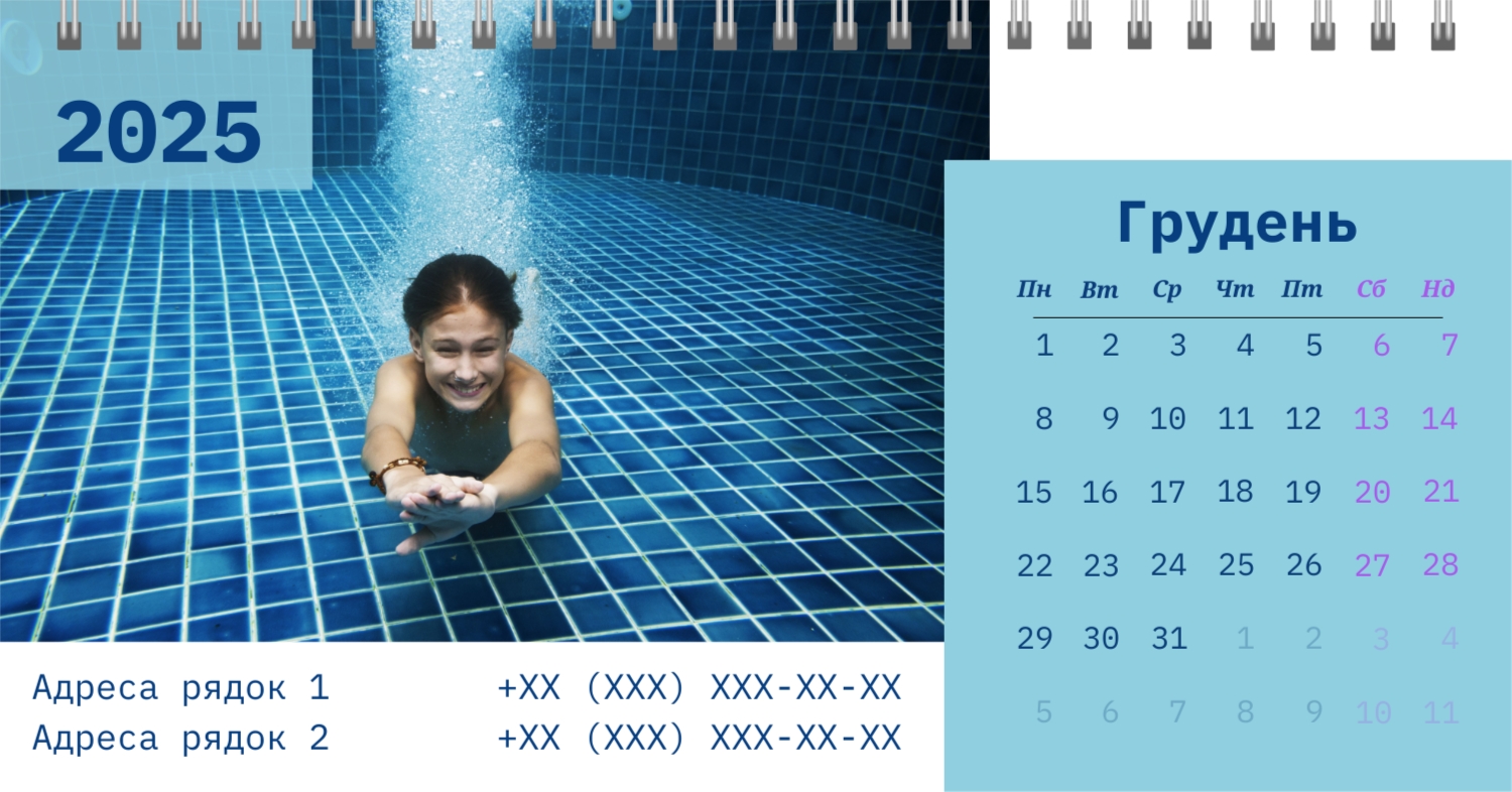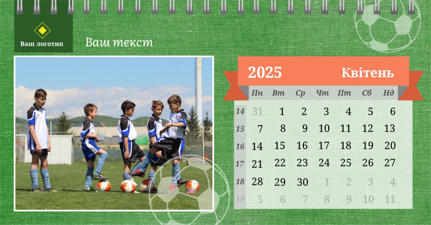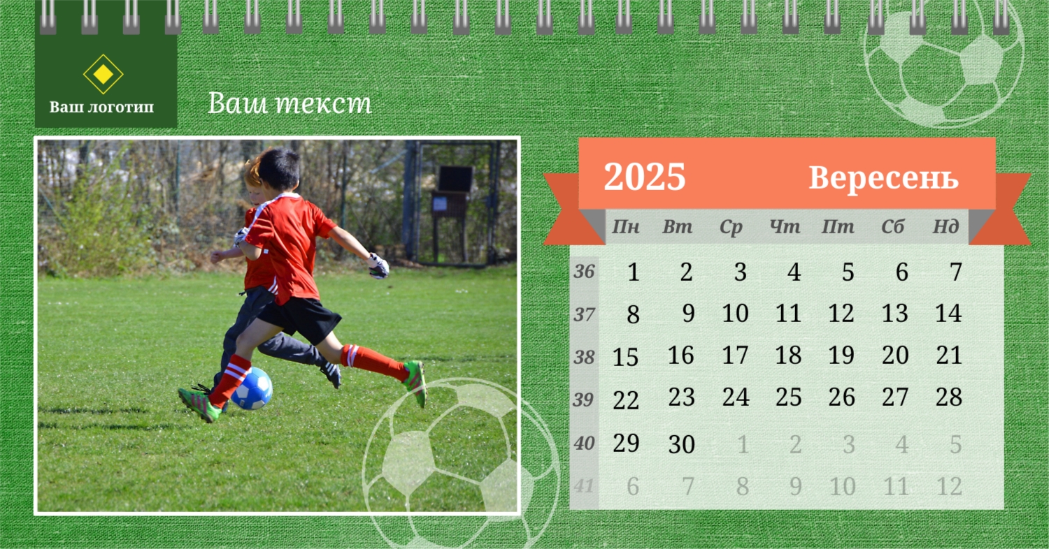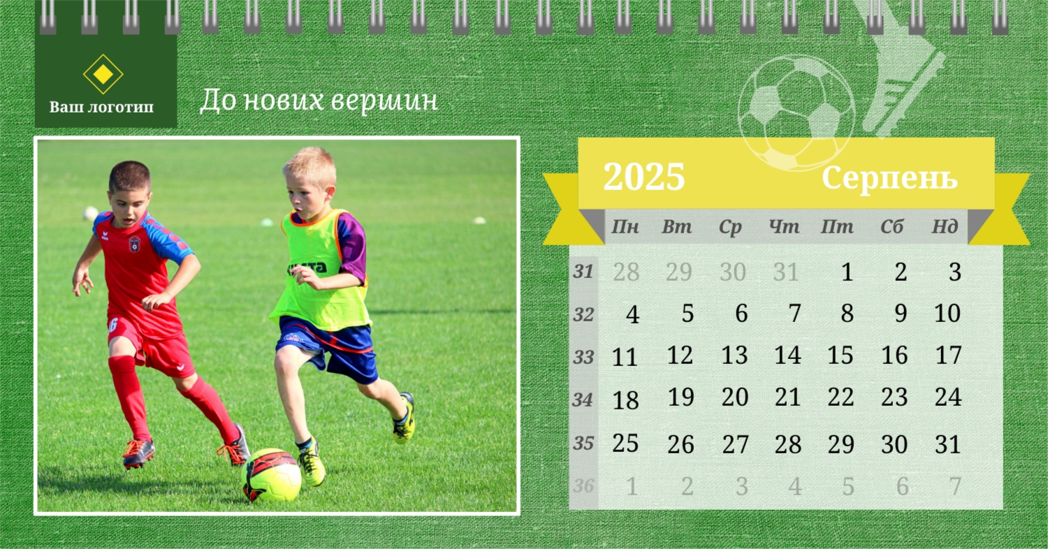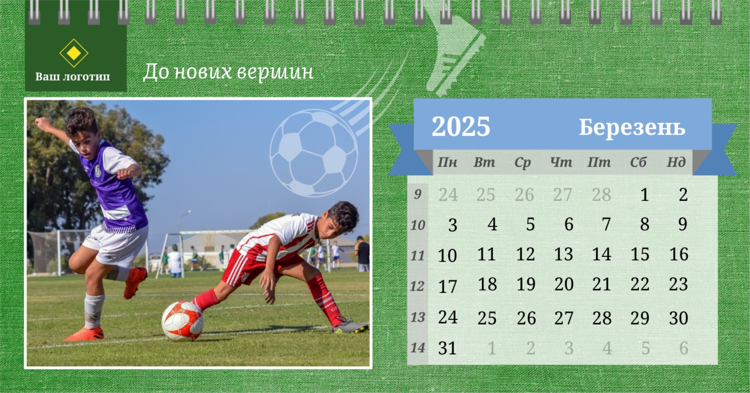 Безкоштовний шаблон рекламного календаря-будиночка онлайн для футбольної школи, футбольного клубу. Створіть макет своїми руками в конструкторі календарів.