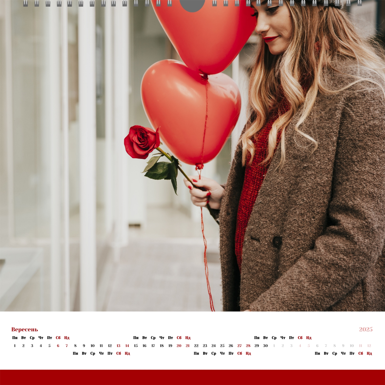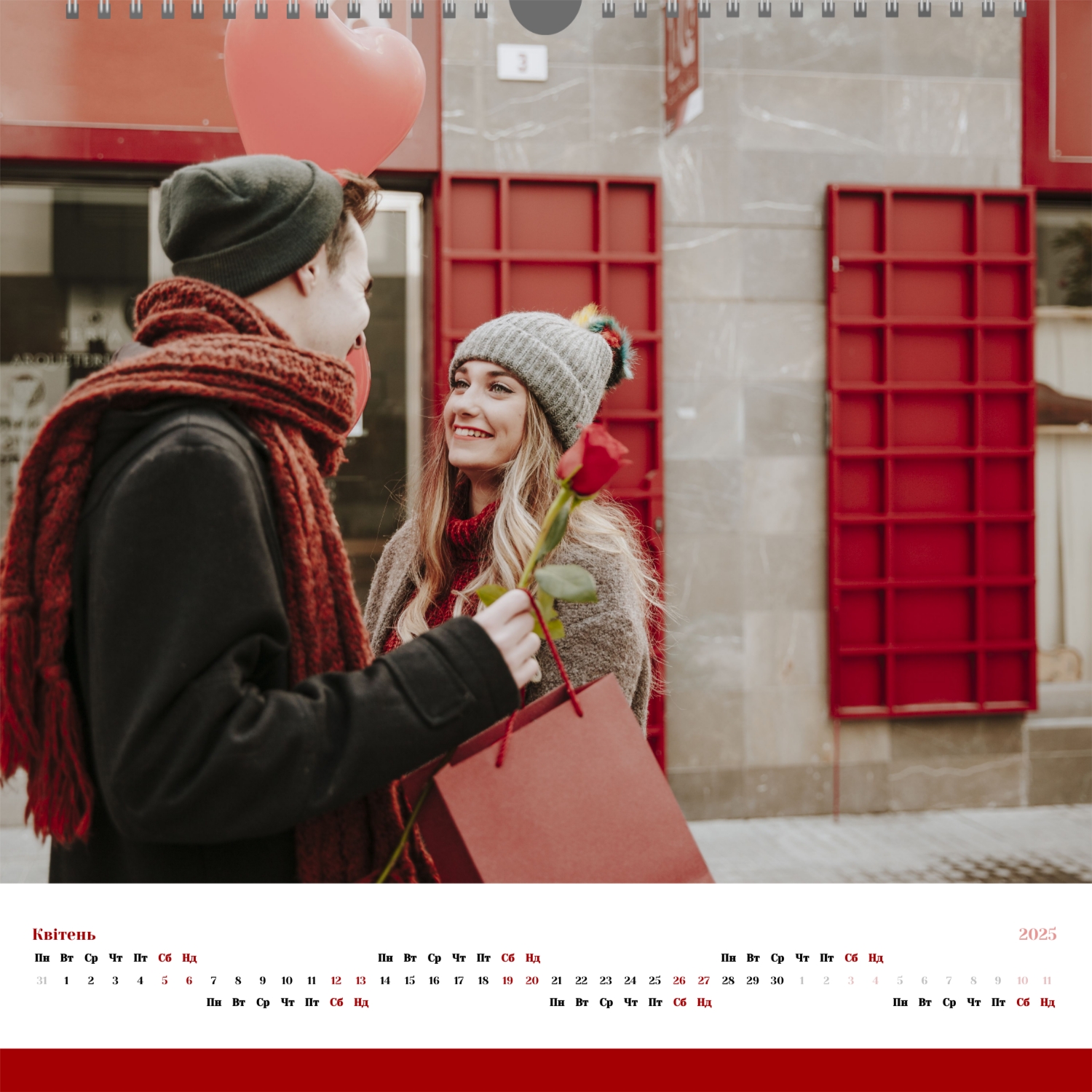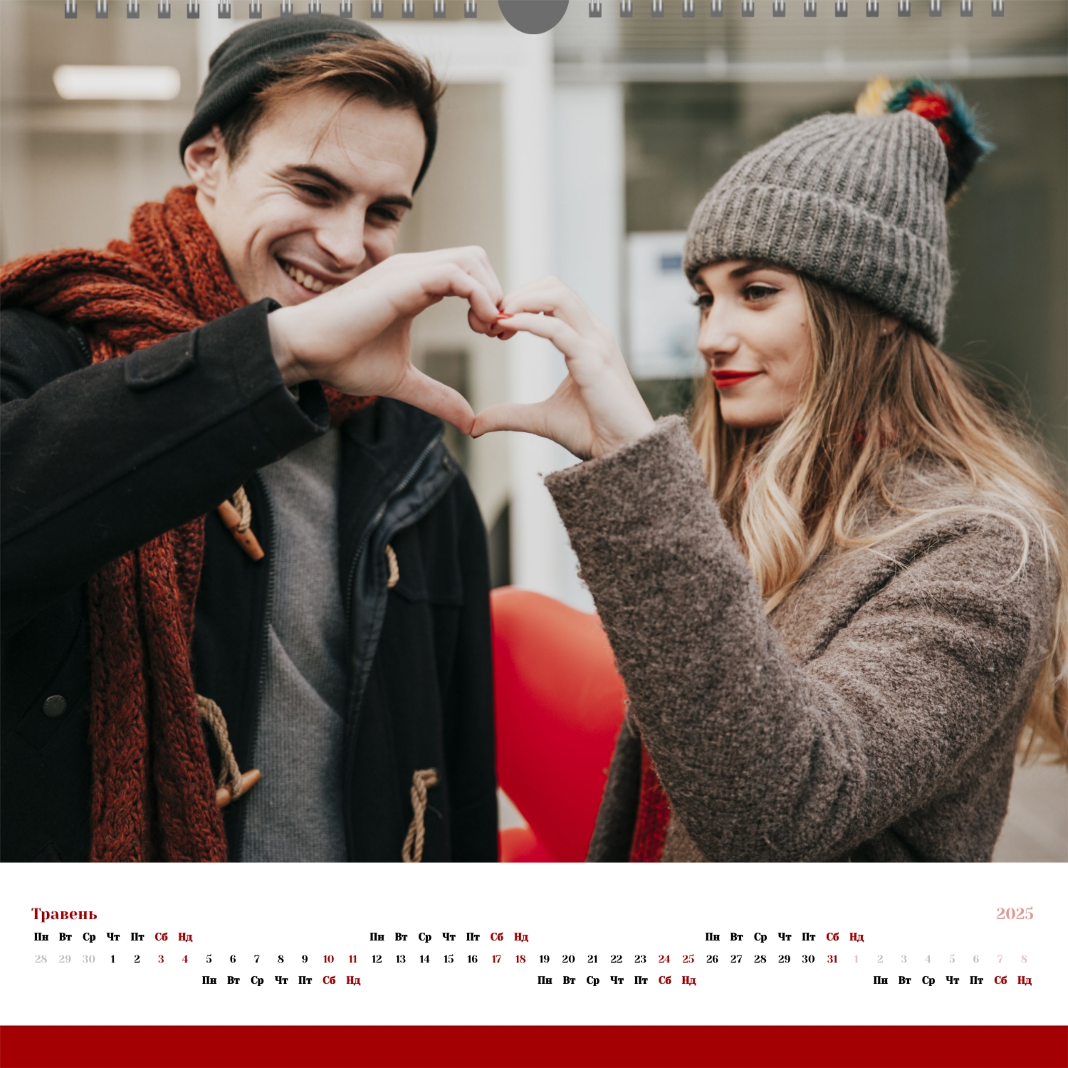 Шаблон календаря "кращі спогади" - це ідеальна основа для створення персоналізованого настінного квадратного календаря, який буде відображати найбільш значущі моменти Вашого життя. Цей шаблон Підходить для будь-якого користувача, хто хоче підкреслити індивідуальність і зберегти важливі події в стильному і функціональному форматі. Особливо він буде корисний фотографам, сімейним парам, власникам творчих студій або малих бізнесів, які хочуть створити унікальний продукт для клієнтів або подарувати своїм близьким щось особливе. Головна особливість шаблону "кращі спогади" - його універсальність. Ви можете легко адаптувати дизайн під свої потреби за допомогою нашого зручного онлайн-конструктора. Редагування дозволяє замінити фотографії, додати текстові блоки з важливими датами або надихаючими цитатами, а також вибрати колірну гамму, яка підкреслить ваш настрій. Конструктор пропонує простий інтерфейс, де ви буквально своїми руками створюєте унікальний календар, додаючи особисті штрихи і експериментуючи з елементами дизайну.