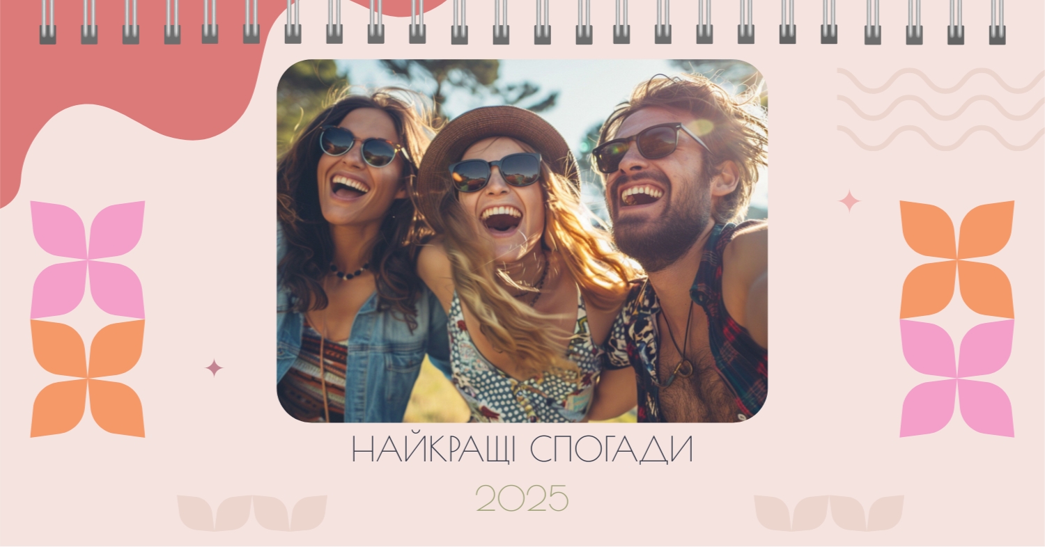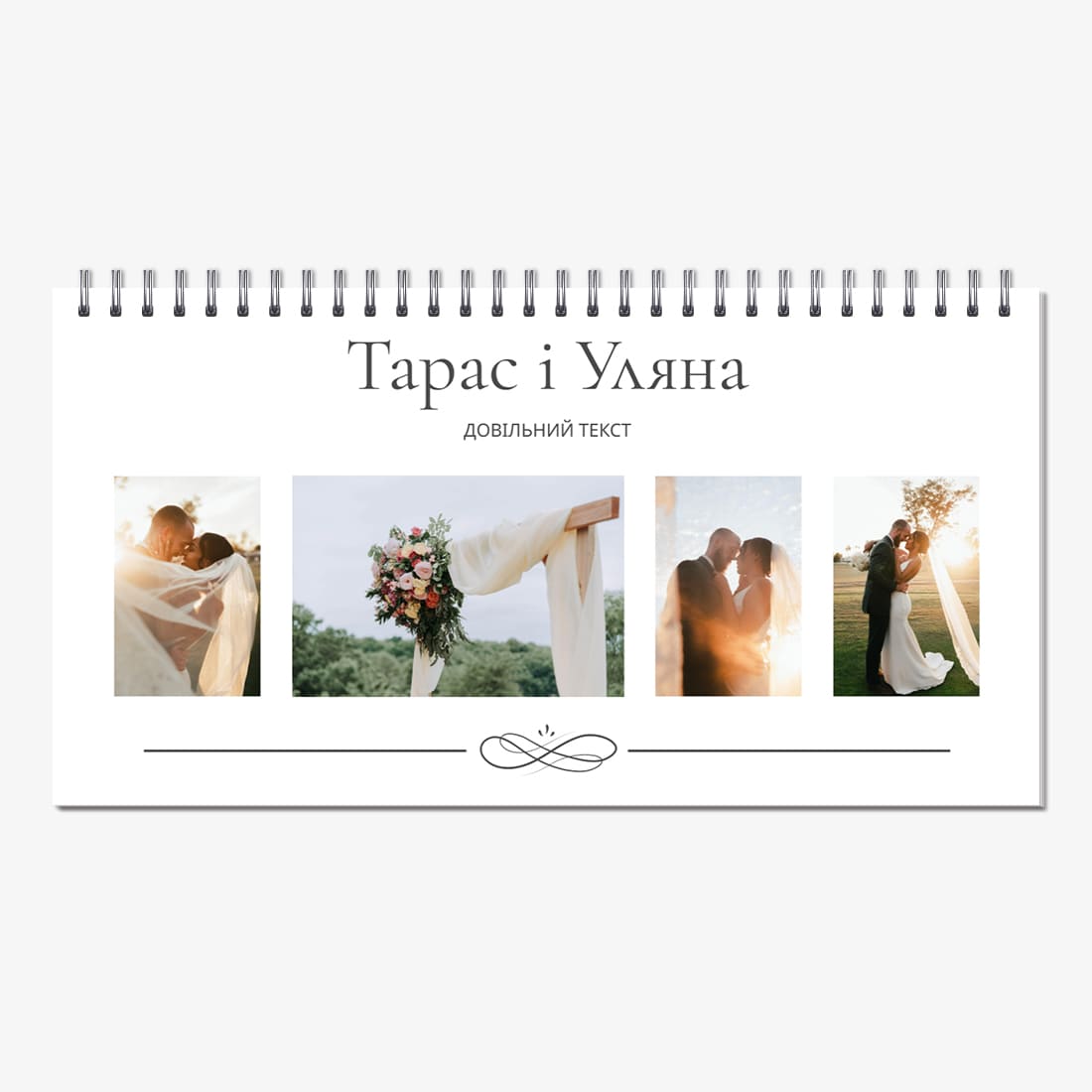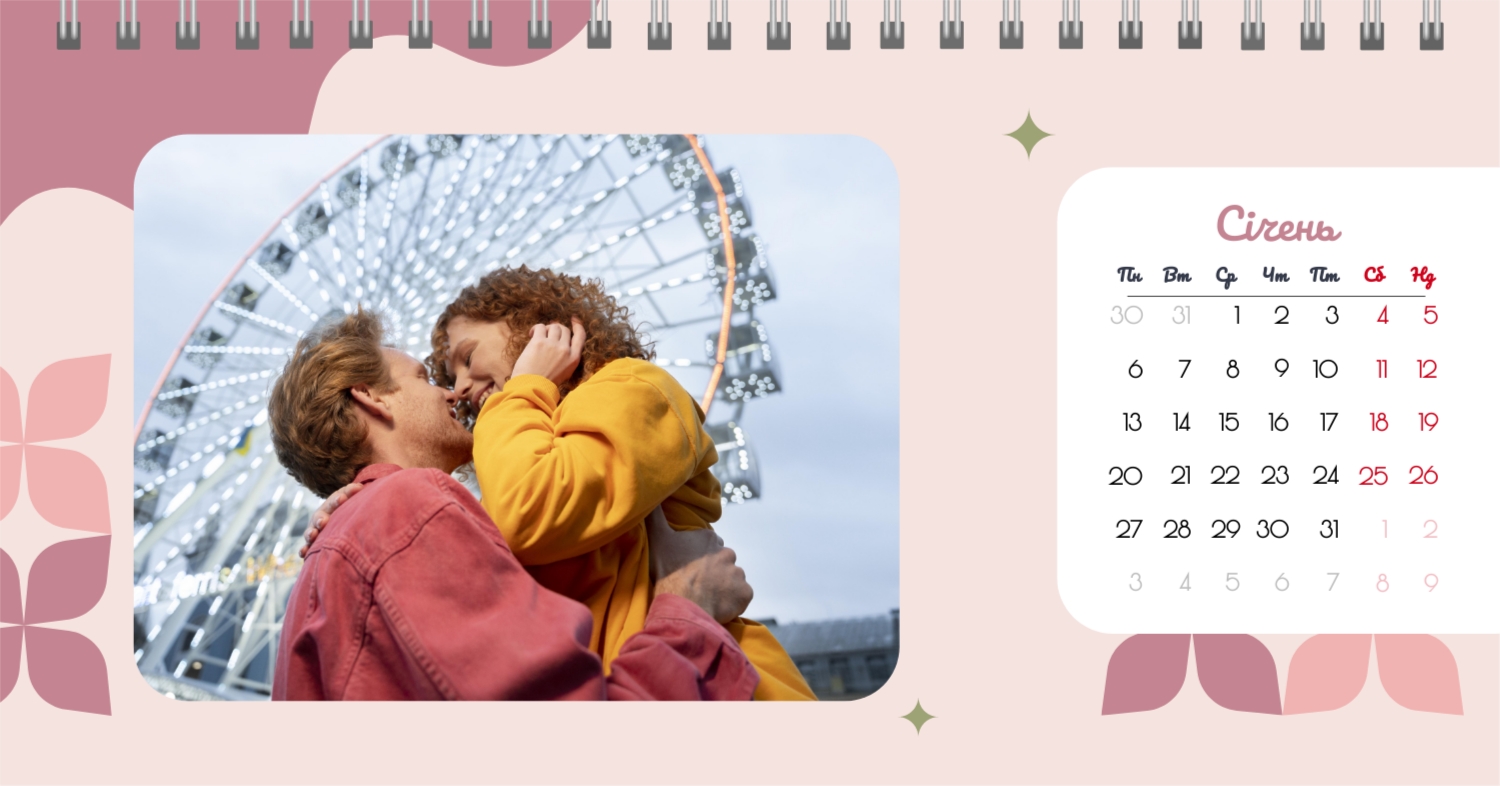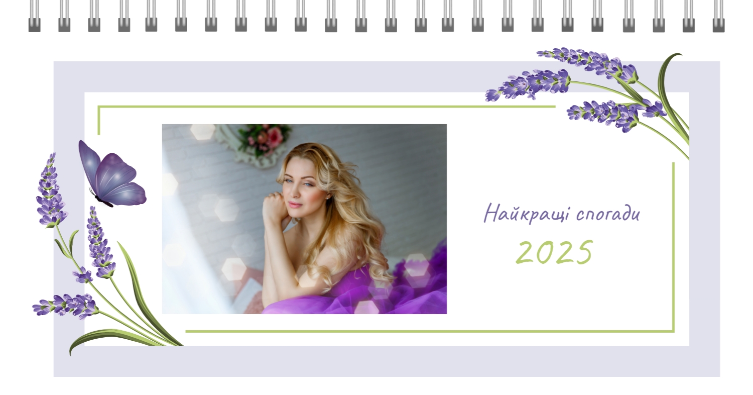 Шаблон календаря "кращі спогади" - це ідеальна основа для створення персоналізованого настільного календаря на 13 сторінок, який буде відображати найзначніші моменти Вашого життя. Цей шаблон Підходить для будь-якого користувача, хто хоче підкреслити індивідуальність і зберегти важливі події в стильному і функціональному форматі. Особливо він буде корисний фотографам, сімейним парам, власникам творчих студій або малих бізнесів, які хочуть створити унікальний продукт для клієнтів або подарувати своїм близьким щось особливе. Ви можете легко адаптувати дизайн настільного календаря під свої потреби за допомогою нашого зручного онлайн-конструктора. Редагування дозволяє замінити фотографії, додати текстові блоки з важливими датами або надихаючими цитатами, а також вибрати колірну гамму, яка підкреслить ваш настрій. Конструктор пропонує простий інтерфейс, де ви буквально своїми руками створюєте унікальний календар, додаючи особисті штрихи і експериментуючи з елементами дизайну.