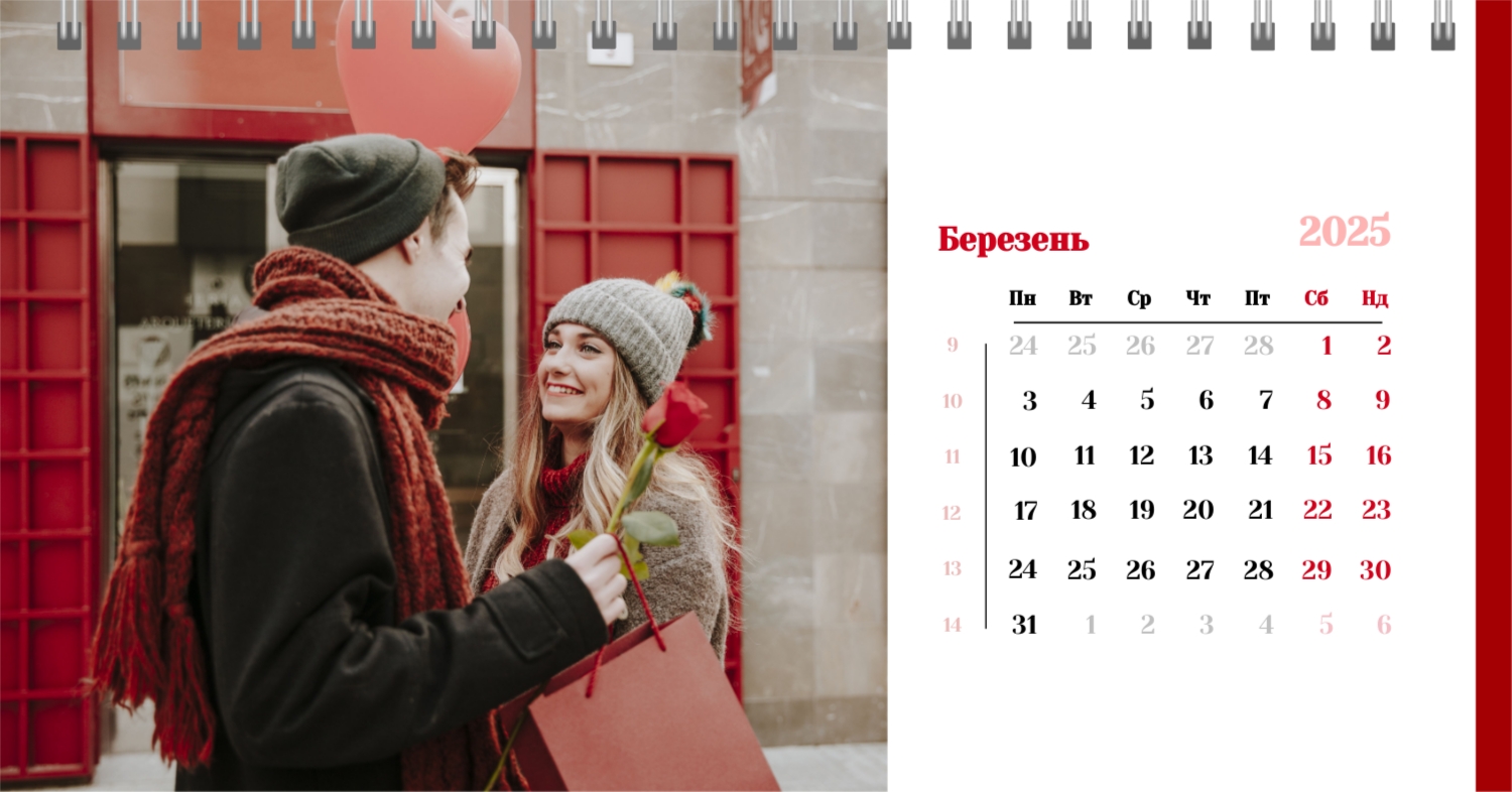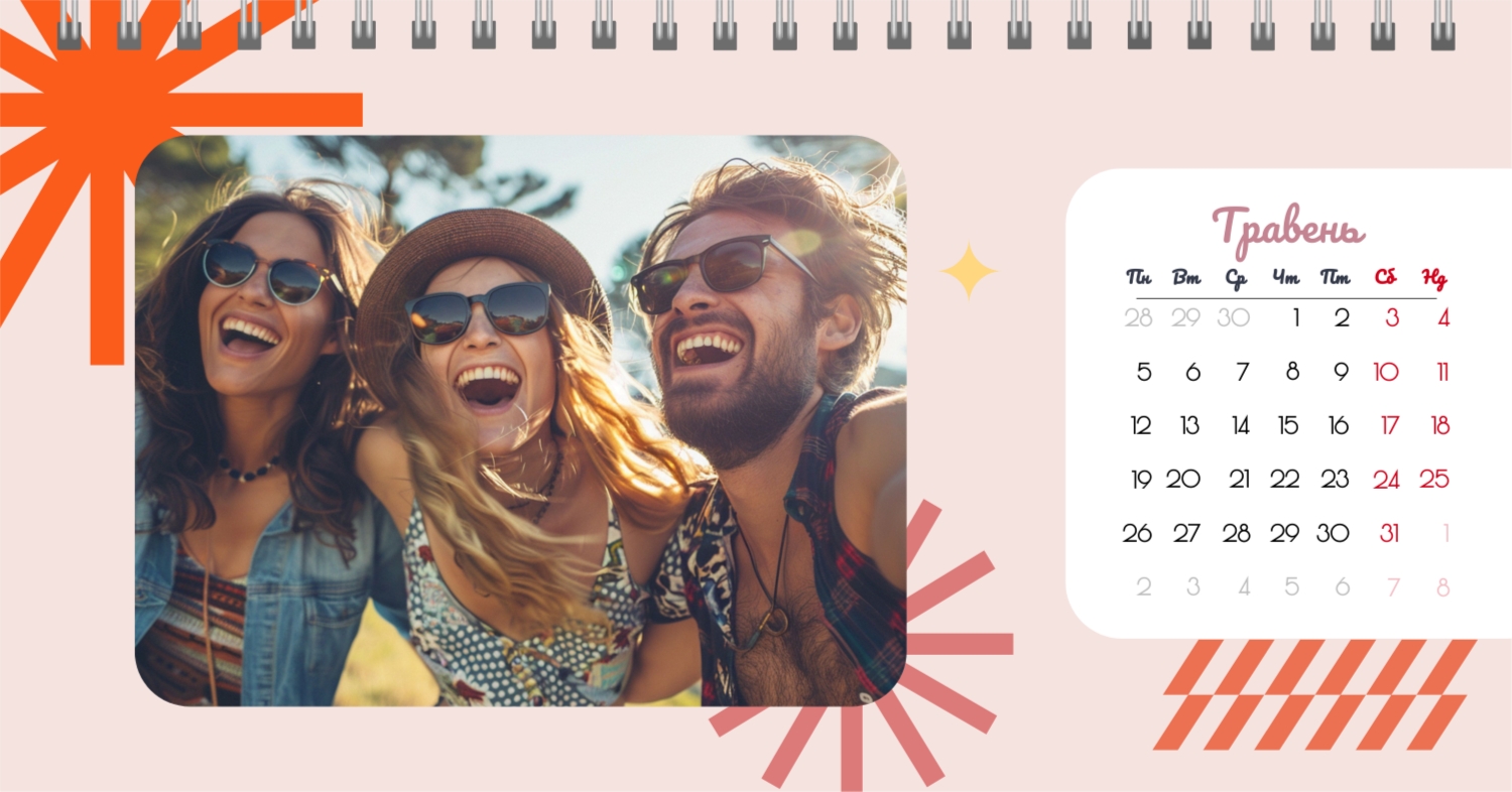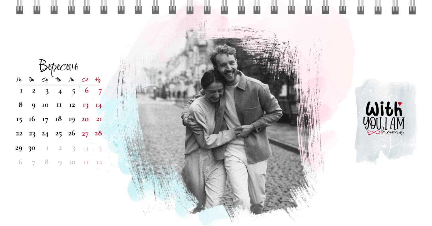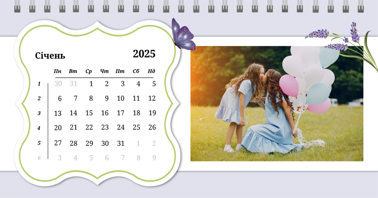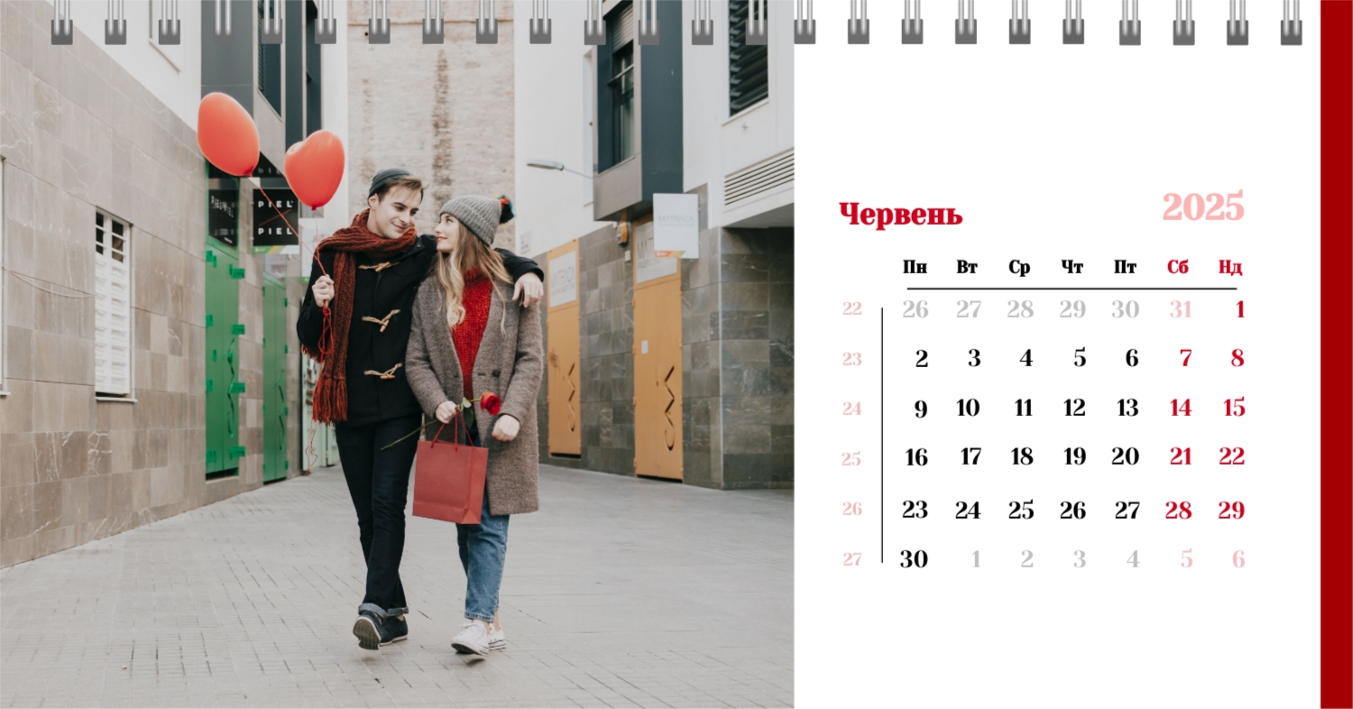 Шаблон календаря "кращі спогади" - це ідеальна основа для створення персоналізованого настільного календаря на 13 сторінок, який буде відображати найзначніші моменти Вашого життя. Цей шаблон Підходить для будь-якого користувача, хто хоче підкреслити індивідуальність і зберегти важливі події в стильному і функціональному форматі. Особливо він буде корисний фотографам, сімейним парам, власникам творчих студій або малих бізнесів, які хочуть створити унікальний продукт для клієнтів або подарувати своїм близьким щось особливе. Ви можете легко адаптувати дизайн настільного календаря під свої потреби за допомогою нашого зручного онлайн-конструктора. Редагування дозволяє замінити фотографії, додати текстові блоки з важливими датами або надихаючими цитатами, а також вибрати колірну гамму, яка підкреслить ваш настрій. Конструктор пропонує простий інтерфейс, де ви буквально своїми руками створюєте унікальний календар, додаючи особисті штрихи і експериментуючи з елементами дизайну.