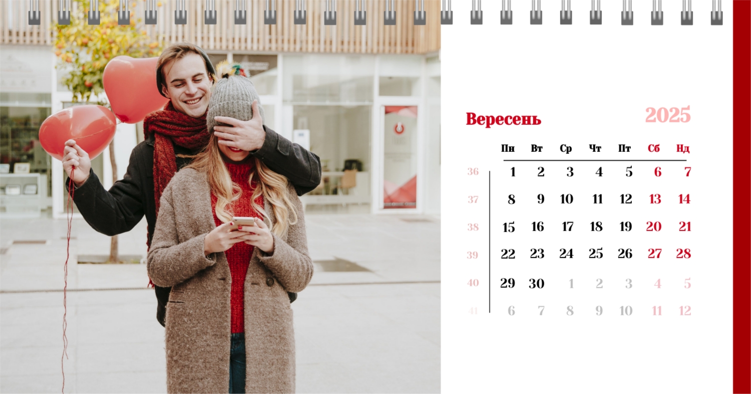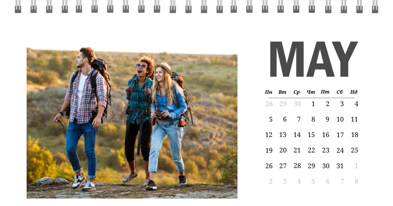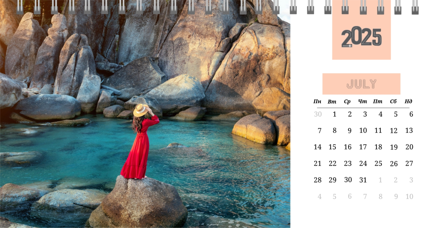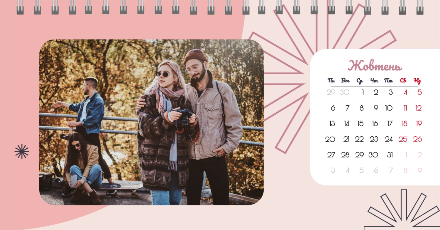 Шаблон календаря "кращі спогади" - це ідеальна основа для створення персоналізованого настільного календаря на 13 сторінок, який буде відображати найзначніші моменти Вашого життя. Цей шаблон Підходить для будь-якого користувача, хто хоче підкреслити індивідуальність і зберегти важливі події в стильному і функціональному форматі. Особливо він буде корисний фотографам, сімейним парам, власникам творчих студій або малих бізнесів, які хочуть створити унікальний продукт для клієнтів або подарувати своїм близьким щось особливе. Ви можете легко адаптувати дизайн настільного календаря під свої потреби за допомогою нашого зручного онлайн-конструктора. Редагування дозволяє замінити фотографії, додати текстові блоки з важливими датами або надихаючими цитатами, а також вибрати колірну гамму, яка підкреслить ваш настрій. Конструктор пропонує простий інтерфейс, де ви буквально своїми руками створюєте унікальний календар, додаючи особисті штрихи і експериментуючи з елементами дизайну.