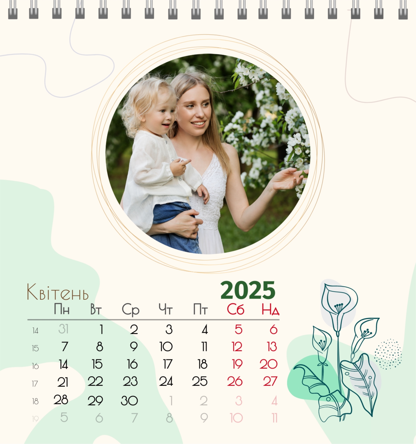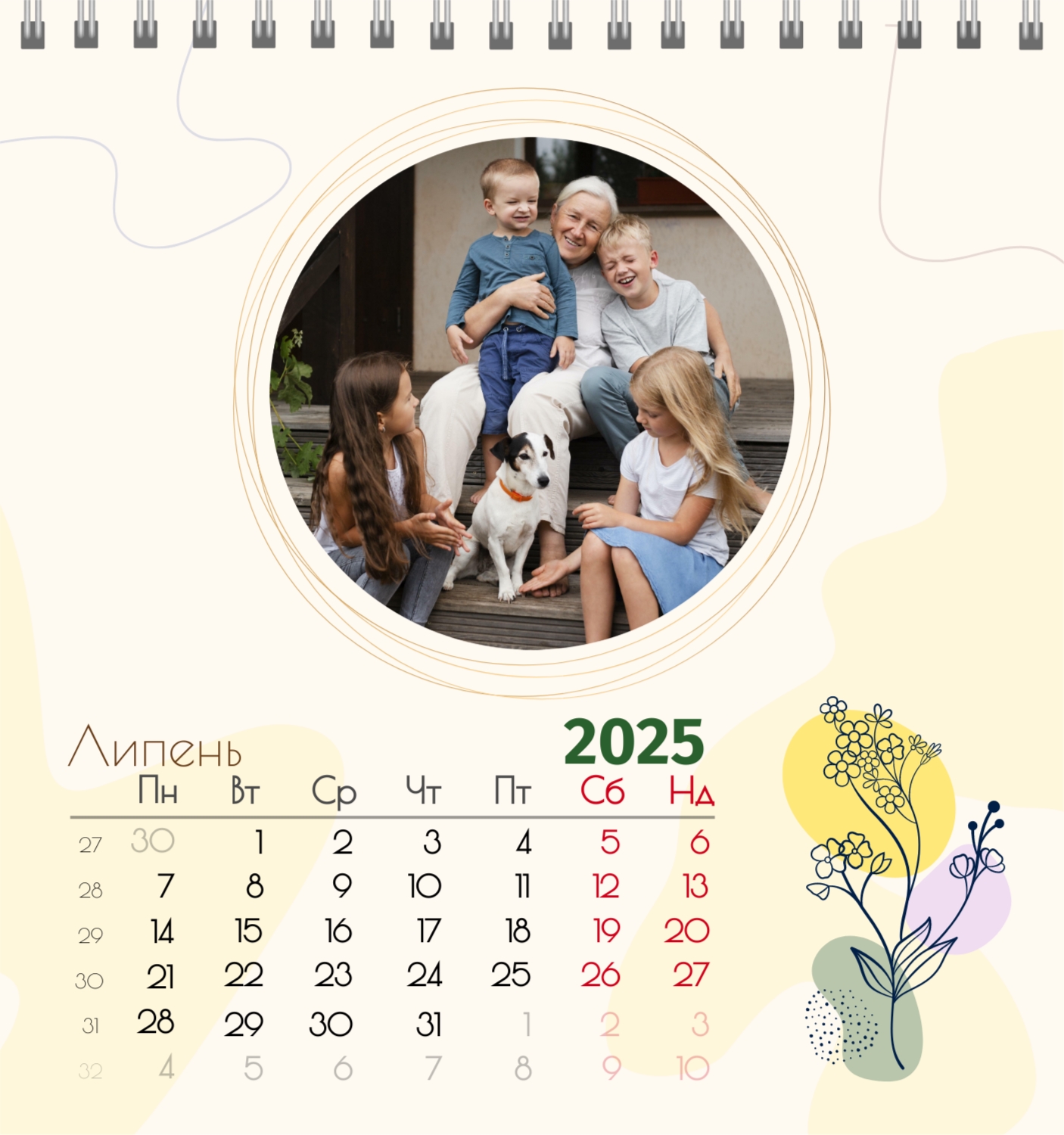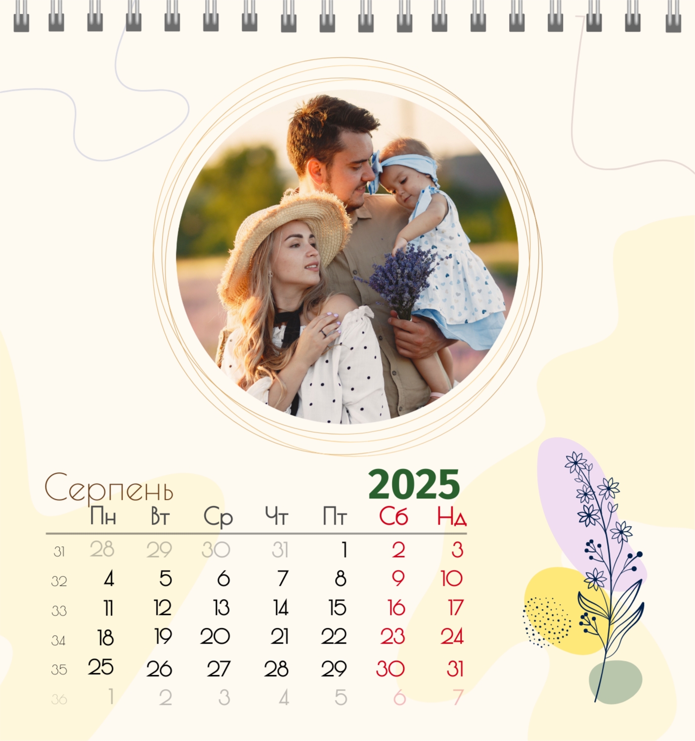 Календар з фото сім'ї-це не просто практичний інструмент для планування, а й тепле нагадування про найближчих людей. Вже готовий шаблон дозволяє легко створити унікальний настільний календар на 13 сторінок, який буде радувати вас цілий рік. Такий шаблон ідеально підходить для сімей, які бажають зберегти спогади, а також для професіоналів, які цінують індивідуальність і хочуть додати особистий акцент в свої проекти. Головна перевага цього шаблону-простота редагування в нашому онлайн-конструкторі. Ви можете додавати свої фотографії, змінювати розташування елементів, вибирати стиль шрифтів і навіть підбирати колірну гамму під свій смак. У конструкторі передбачені зручні інструменти, щоб ви могли максимально точно адаптувати календар під свої потреби. Хочете залишити більше місця для нотаток або виділити важливі дати? Це легко зробити завдяки гнучкості налаштувань.