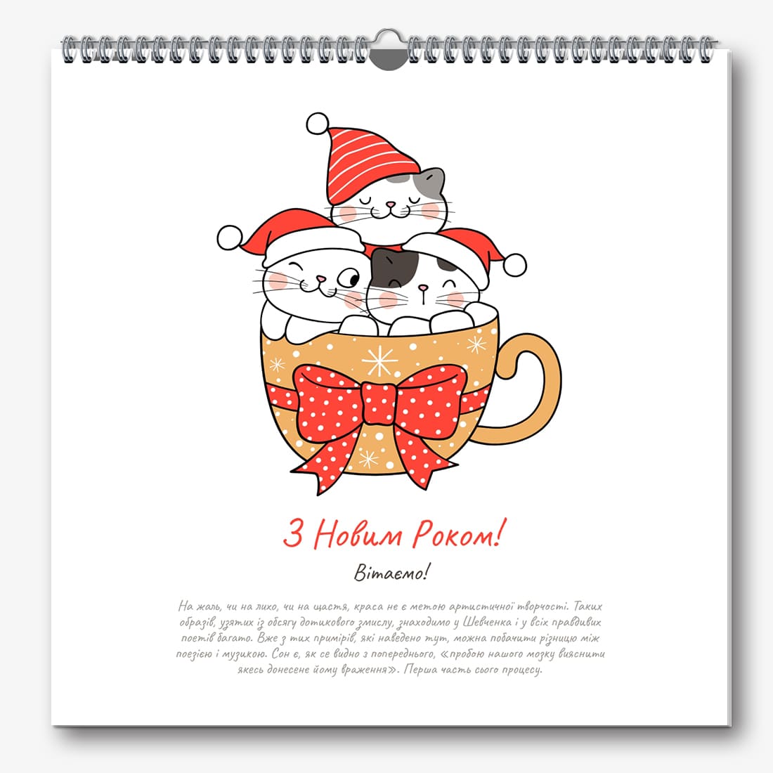 Готовий шаблон настінного календаря з різдвяним дизайном-це ідеальне рішення для створення святкового настрою і організації часу в яскравий сезон свят. Шаблон виконаний в класичному різдвяному стилі з елементами, які асоціюються з затишком, теплом і чарами зими. Цей настінний квадратний календар підійде для багатьох сфер. Наприклад, він стане прекрасним подарунком для клієнтів і партнерів в бізнесі. Компанії, що займаються продажем товарів або послуг, зможуть використовувати його для демонстрації своєї турботи і уваги до клієнтів. Представникам творчих професій, таким як дизайнери, фотографи або художники, шаблон допоможе підкреслити їх стиль через індивідуальний підхід. Власники кафе, магазинів або салонів краси можуть доповнити календар логотипом і контактами, щоб зробити його одночасно корисним і рекламним інструментом. Редагування цього шаблону в нашому онлайн-конструкторі максимально зручно і інтуїтивно зрозуміло. Ви можете змінити текст, додавши назву компанії, особисте привітання або важливі для вас дати. Також легко замінити зображення, додавши фотографії своїх співробітників, продукції або особисті сімейні знімки. Завдяки вбудованим інструментам редагування можна регулювати шрифти, їх розміри і кольори, щоб створити унікальний календар, що ідеально підходить під ваші завдання.
