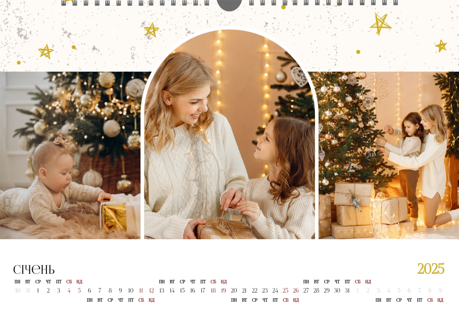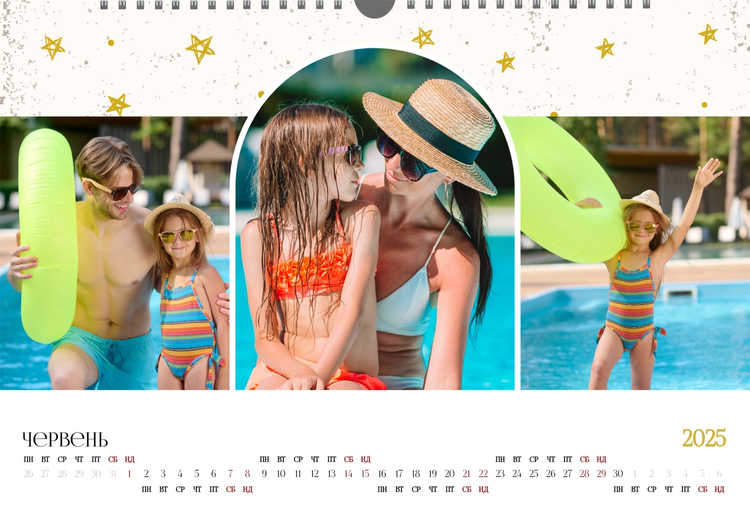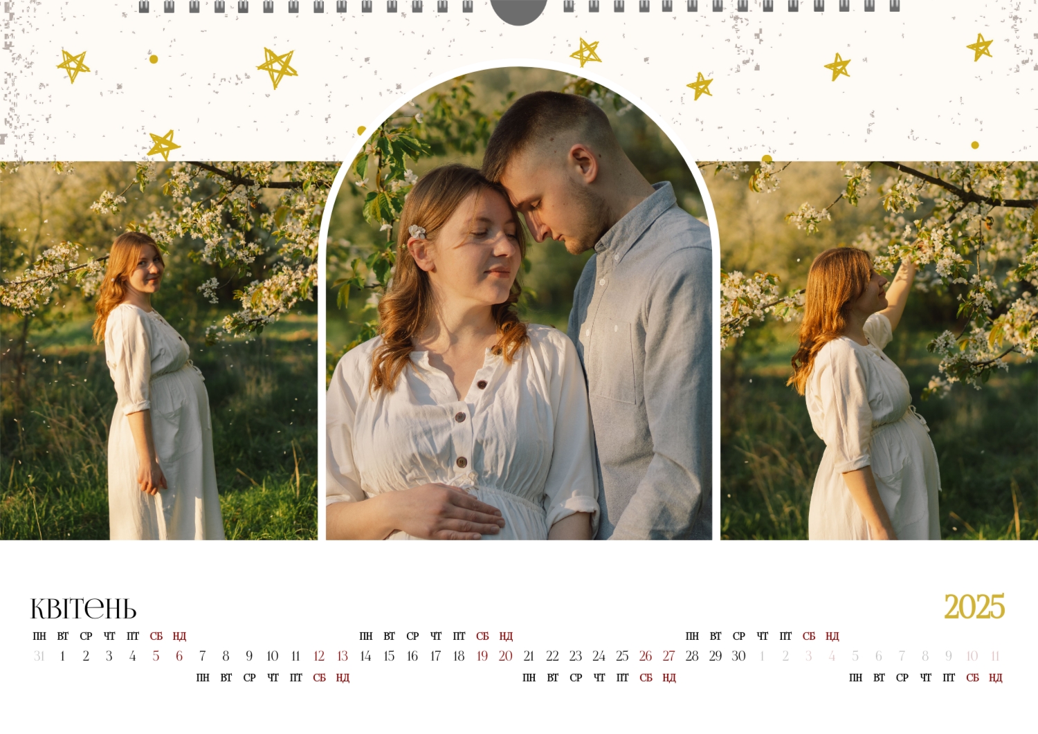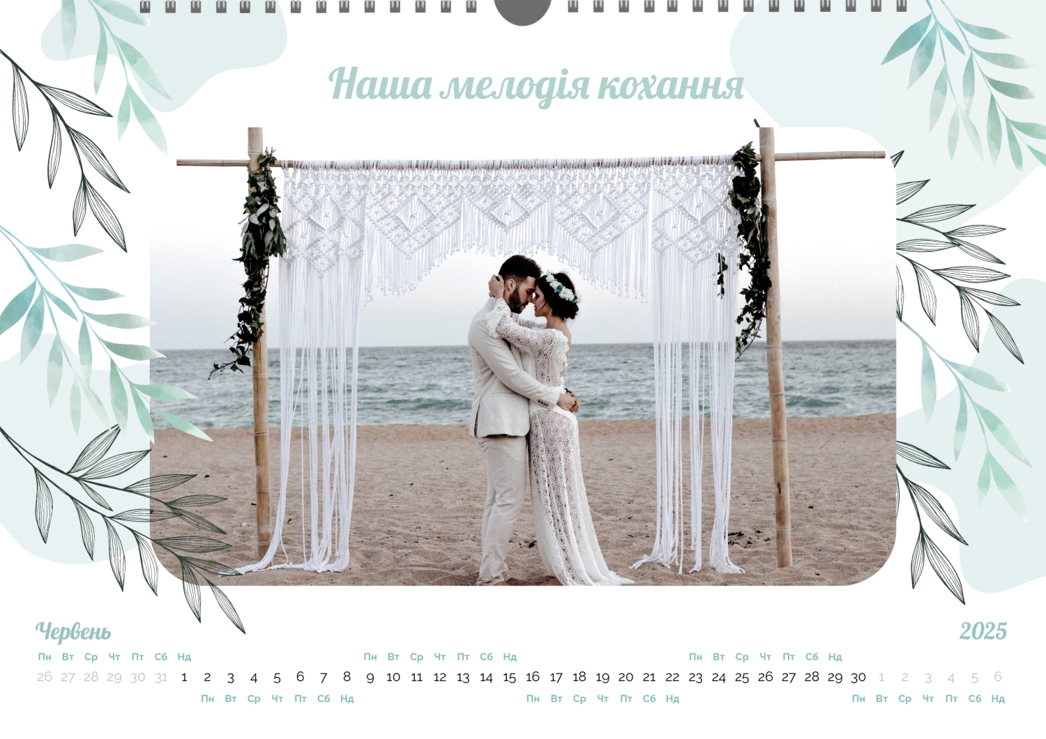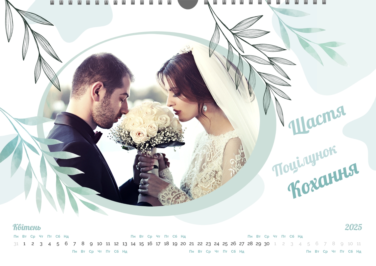 Календар "Наша сім'я" з весільними фото — це готовий шаблон, який прекрасно підходить для створення унікального і пам'ятного сімейного календаря. Його теплий і романтичний стиль робить його ідеальним для пар, які бажають зберегти спогади про весілля, або для тих, хто хоче подарувати близьким щось особливе. Такий Настінний Горизонтальний календар може стати відмінним подарунком для батьків, родичів або навіть друзів, які були частиною вашого важливого події. Ви можете замінити фотографії на свої, підбираючи найбільш зворушливі моменти весілля, змінити підписи, додавши імена, дати або короткі фрази, які будуть нагадувати про яскраві моменти вашої історії. В онлайн-конструкторі також легко адаптувати кольори, шрифти і розташування елементів, щоб календар повністю відображав вашу унікальність і стиль. Створення такого календаря своїми руками не вимагає спеціальних навичок. Інтуїтивно зрозумілий інтерфейс конструктора дозволяє експериментувати з дизайном, поки результат не стане ідеальним. Підсумковий календар стане не просто функціональним виробом, а й емоційною сімейною реліквією, яка буде радувати вас і ваших близьких протягом усього року.