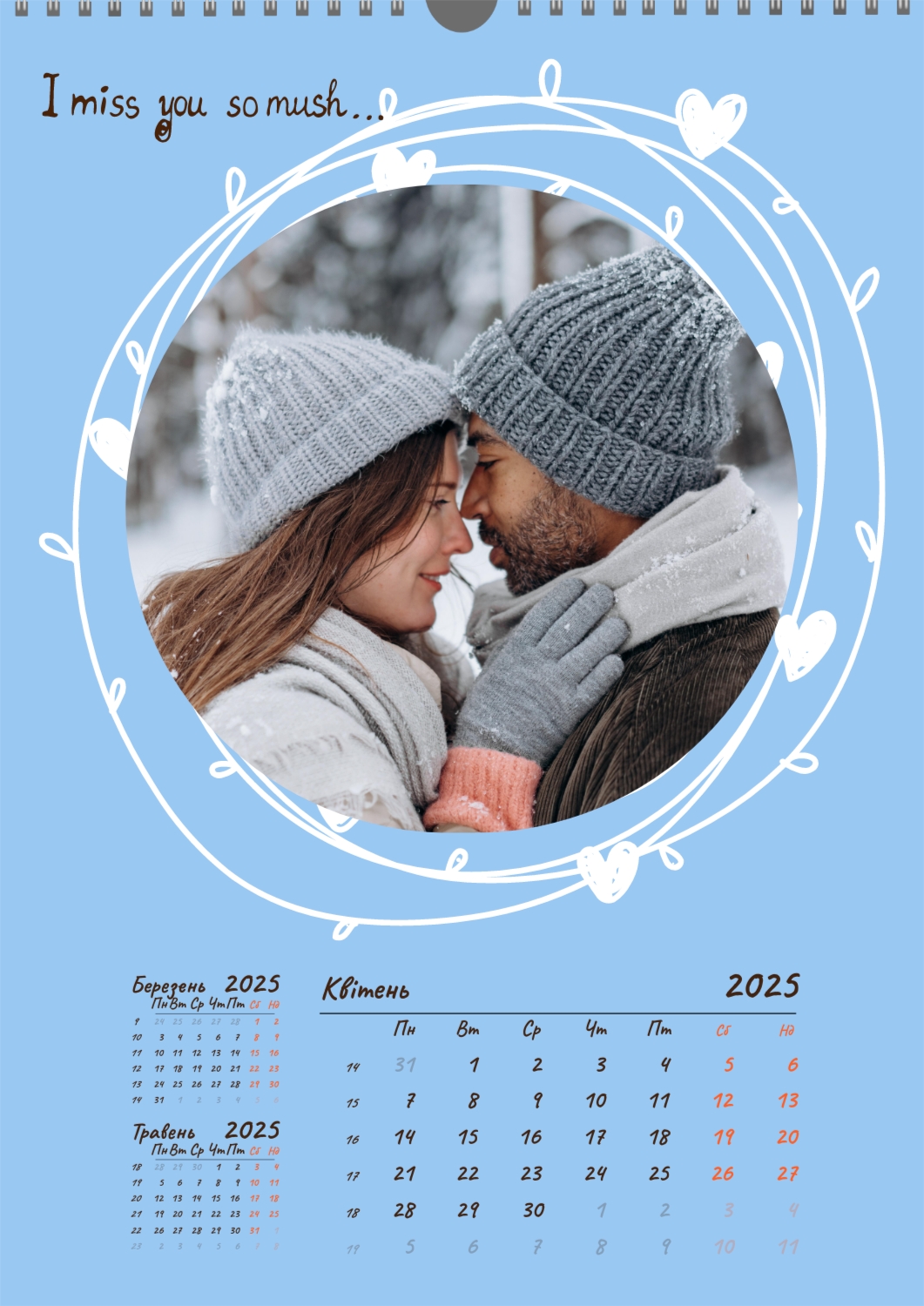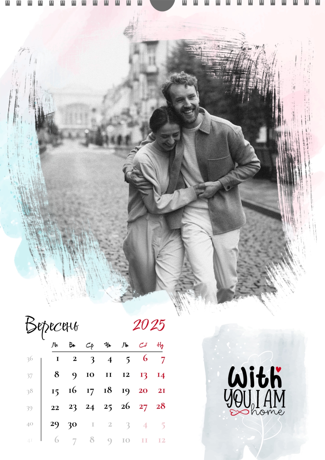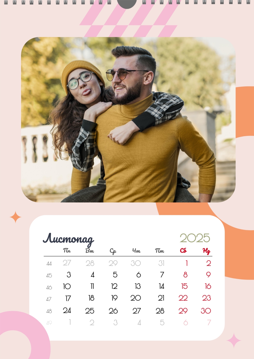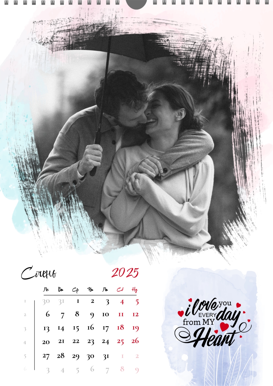 Готовий шаблон календаря для закоханої пари-це ідеальний спосіб створити унікальний і зворушливий подарунок. У ньому передбачений романтичний дизайн, який підкреслює особливий зв'язок між партнерами. Такий календар може стати не тільки приємним сувеніром, але і стильним елементом інтер'єру. Цей шаблон відмінно підходить для фотографів, що спеціалізуються на love story, оскільки з його допомогою можна красиво оформити професійні знімки. Також він буде корисний дизайнерам і блогерам, які працюють в романтичній тематиці, а ще ідеально підійде власникам весільних агентств, які хочуть запропонувати клієнтам незвичайний подарунок. Головна перевага цього календаря-можливість повної персоналізації в нашому онлайн-конструкторі. Ви можете завантажувати свої фотографії, змінювати фон, додавати пам'ятні дати, романтичні підписи або навіть смішні коментарі до кожного місяця. Завдяки простому і інтуїтивно зрозумілому інтерфейсу редагування займе мінімум часу, а результат порадує індивідуальністю і високою якістю. Створюючи такий календар своїми руками, ви вкладаєте в нього тепло і турботу, роблячи його дійсно особливим.