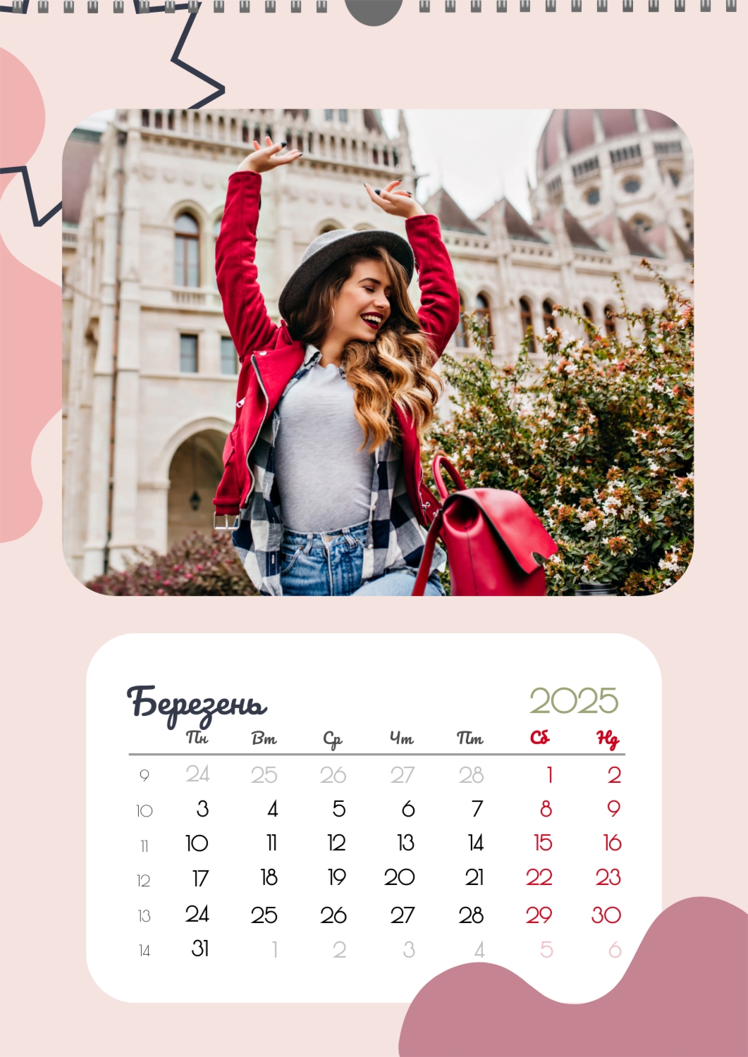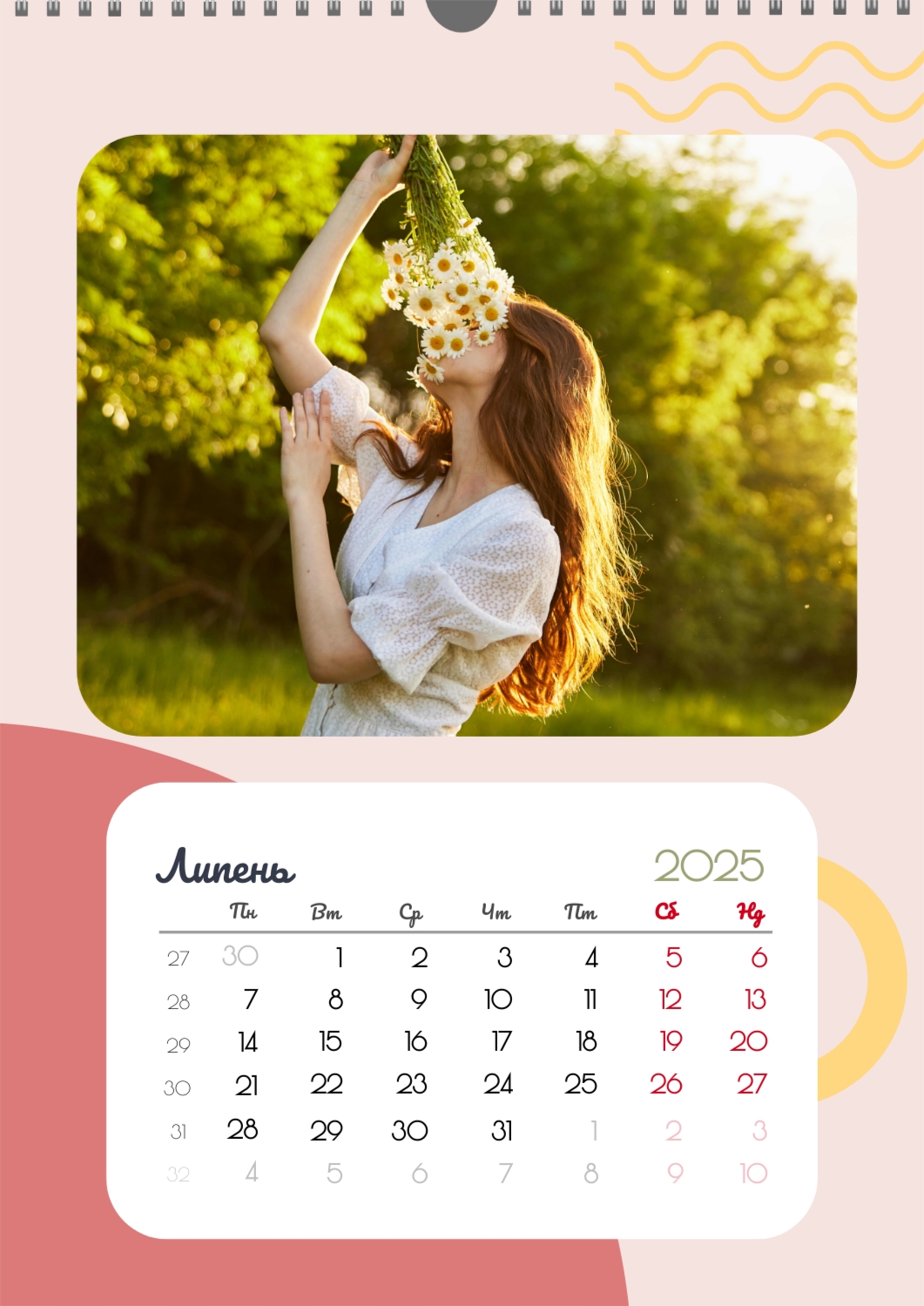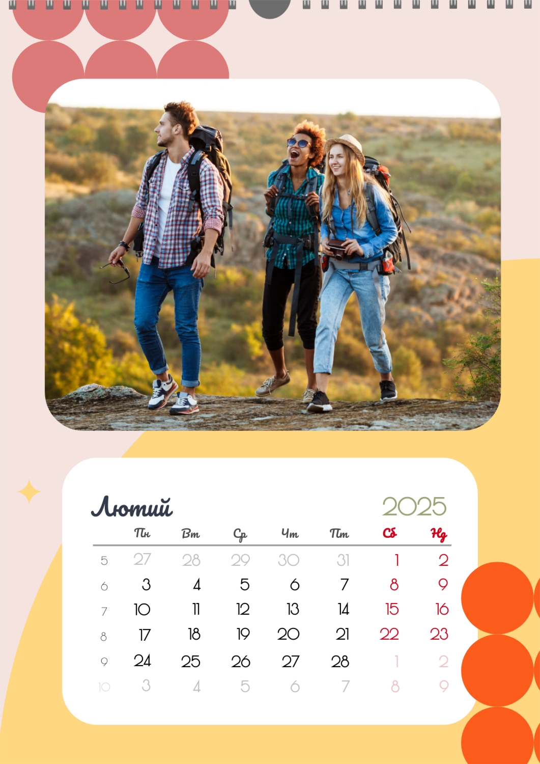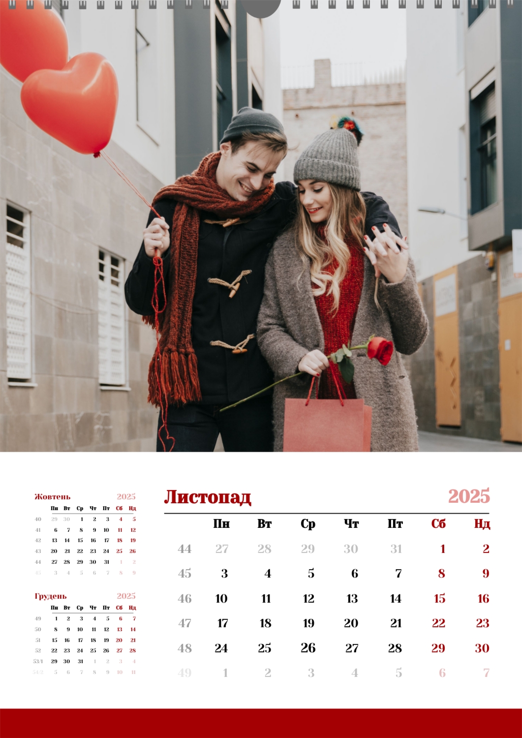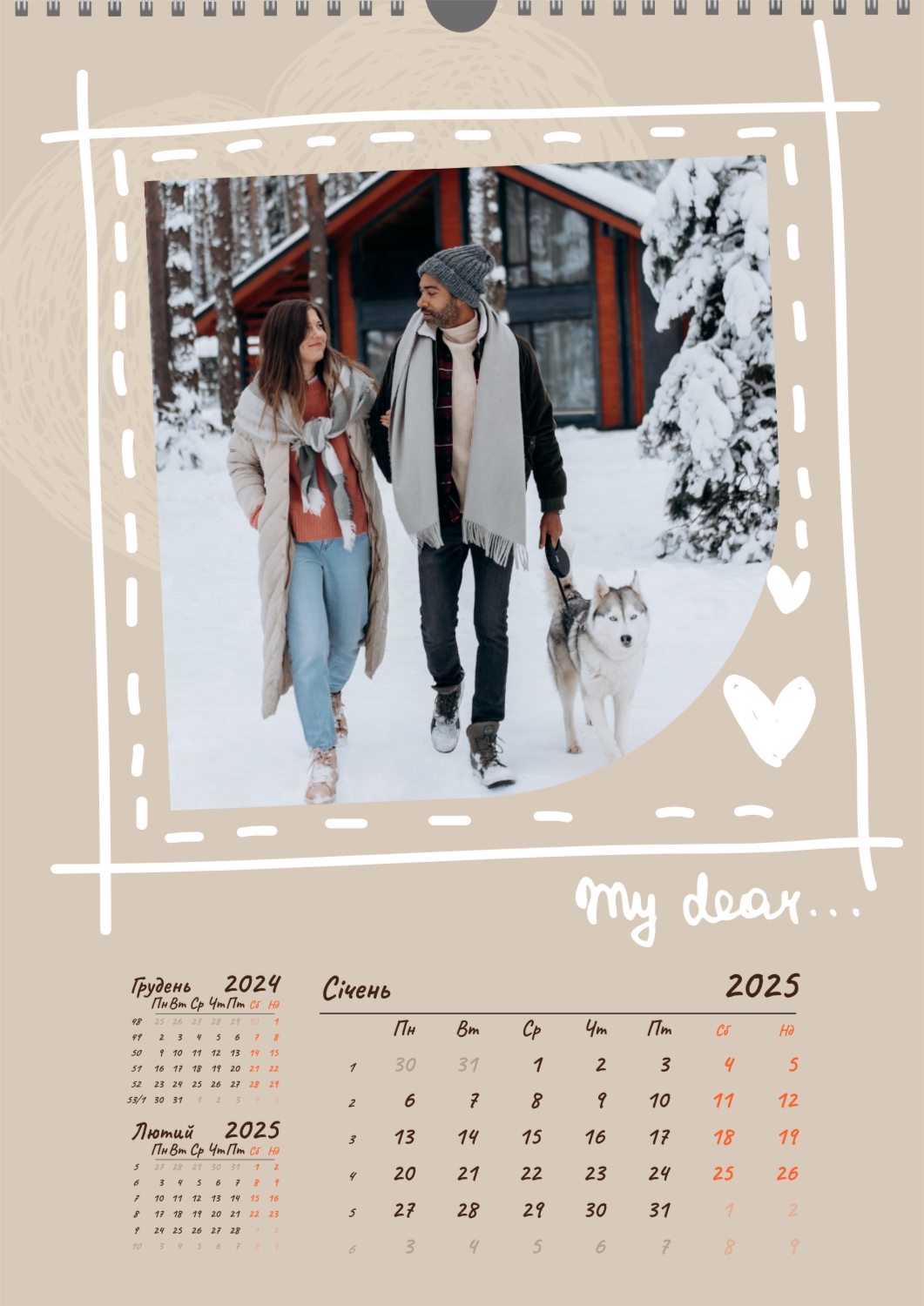 Готовий шаблон календаря для закоханої пари-це ідеальний спосіб створити унікальний і зворушливий подарунок. У ньому передбачений романтичний дизайн, який підкреслює особливий зв'язок між партнерами. Такий календар може стати не тільки приємним сувеніром, але і стильним елементом інтер'єру. Цей шаблон відмінно підходить для фотографів, що спеціалізуються на love story, оскільки з його допомогою можна красиво оформити професійні знімки. Також він буде корисний дизайнерам і блогерам, які працюють в романтичній тематиці, а ще ідеально підійде власникам весільних агентств, які хочуть запропонувати клієнтам незвичайний подарунок. Головна перевага цього календаря-можливість повної персоналізації в нашому онлайн-конструкторі. Ви можете завантажувати свої фотографії, змінювати фон, додавати пам'ятні дати, романтичні підписи або навіть смішні коментарі до кожного місяця. Завдяки простому і інтуїтивно зрозумілому інтерфейсу редагування займе мінімум часу, а результат порадує індивідуальністю і високою якістю. Створюючи такий календар своїми руками, ви вкладаєте в нього тепло і турботу, роблячи його дійсно особливим.