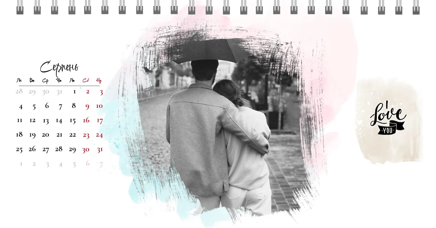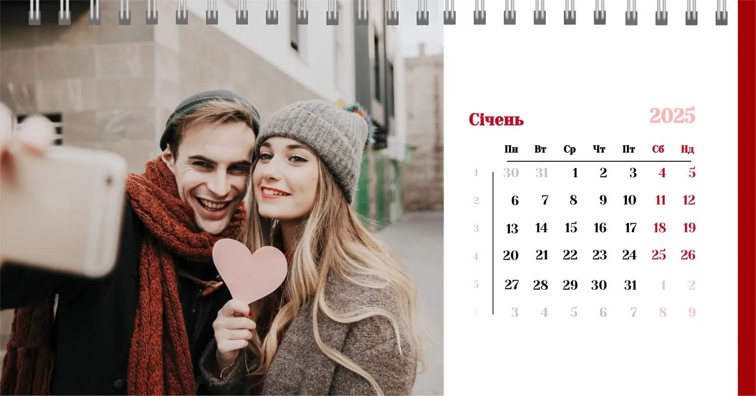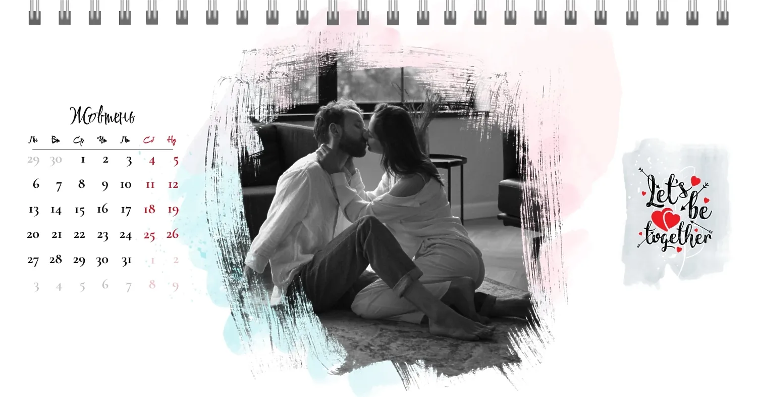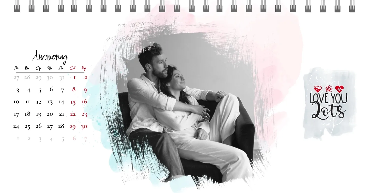 Готовий шаблон настільного календаря для закоханої пари-це ідеальний спосіб створити унікальний і зворушливий подарунок. У ньому передбачений романтичний дизайн, який підкреслює особливий зв'язок між партнерами. Такий настільний календар на 13 сторінок може стати не тільки приємним сувеніром, але і стильним елементом інтер'єру. Цей шаблон відмінно підходить для фотографів, що спеціалізуються на love story, оскільки з його допомогою можна красиво оформити професійні знімки. Головна перевага цього календаря-можливість повної персоналізації в нашому онлайн-конструкторі. Ви можете завантажувати свої фотографії, змінювати фон, додавати пам'ятні дати, романтичні підписи або навіть смішні коментарі до кожного місяця.