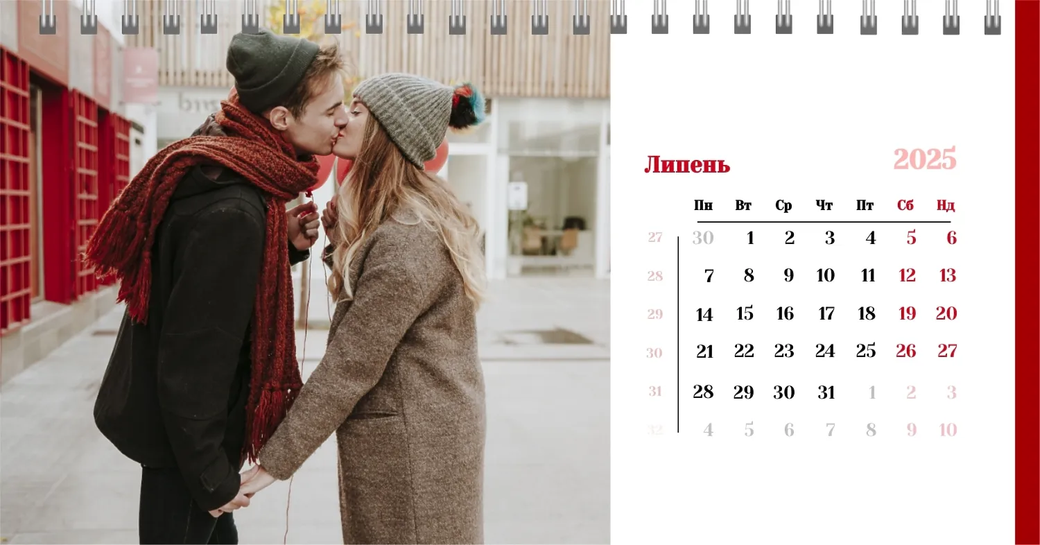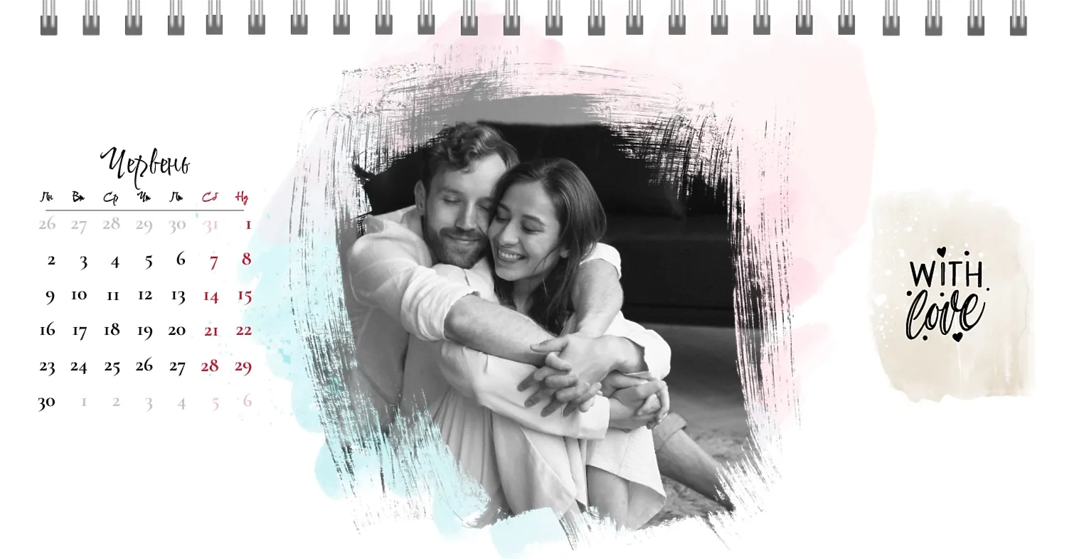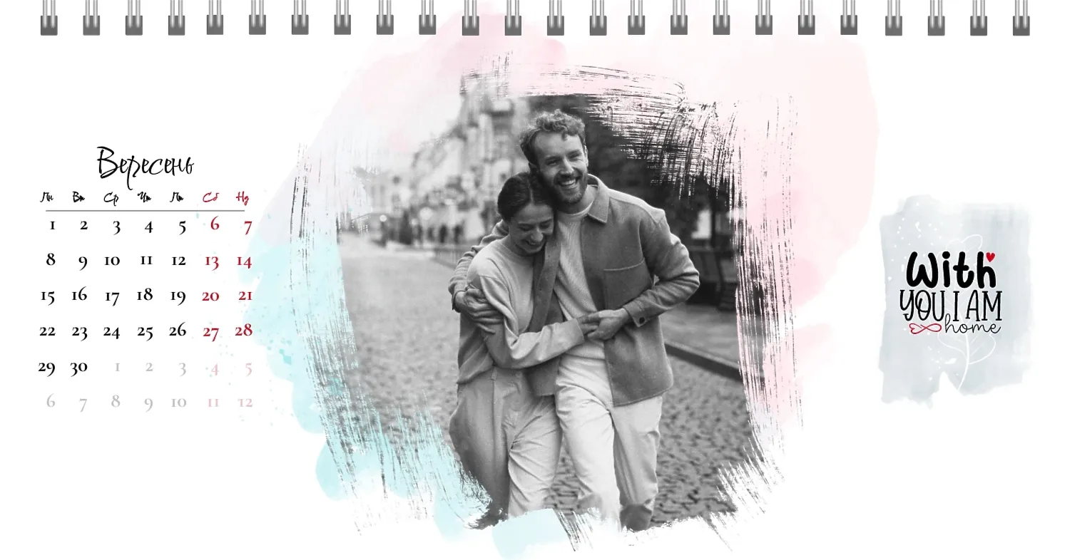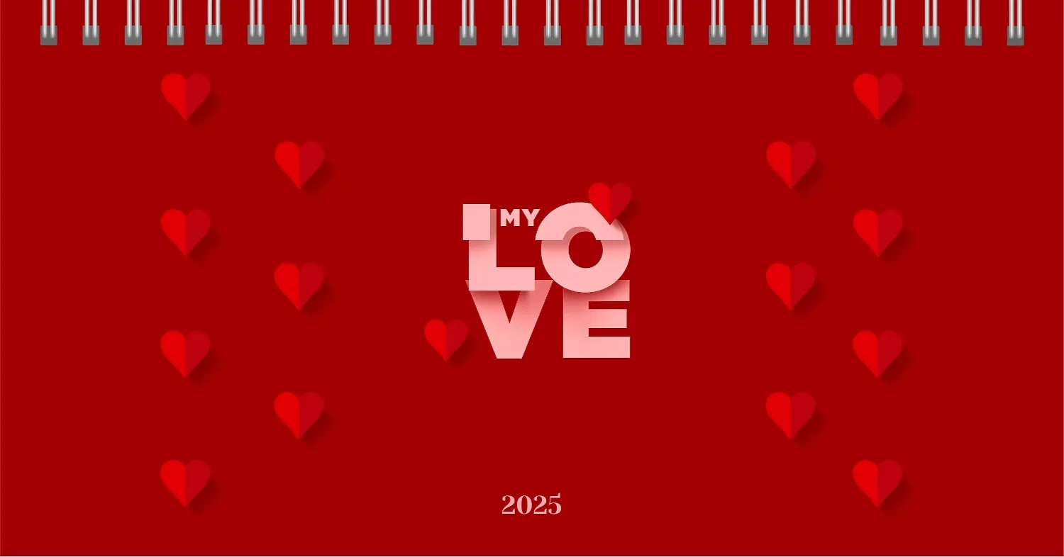 Готовий шаблон настільного календаря для закоханої пари-це ідеальний спосіб створити унікальний і зворушливий подарунок. У ньому передбачений романтичний дизайн, який підкреслює особливий зв'язок між партнерами. Такий настільний календар на 13 сторінок може стати не тільки приємним сувеніром, але і стильним елементом інтер'єру. Цей шаблон відмінно підходить для фотографів, що спеціалізуються на love story, оскільки з його допомогою можна красиво оформити професійні знімки. Головна перевага цього календаря-можливість повної персоналізації в нашому онлайн-конструкторі. Ви можете завантажувати свої фотографії, змінювати фон, додавати пам'ятні дати, романтичні підписи або навіть смішні коментарі до кожного місяця.