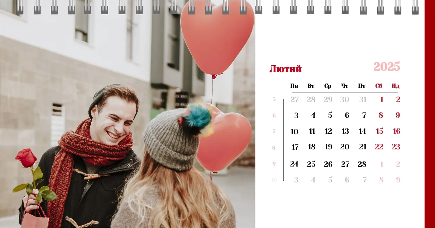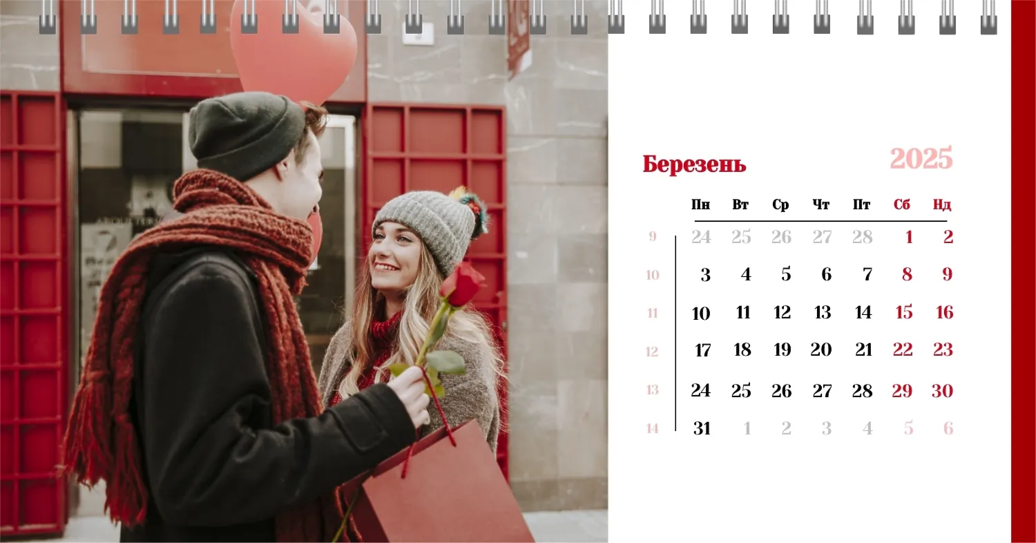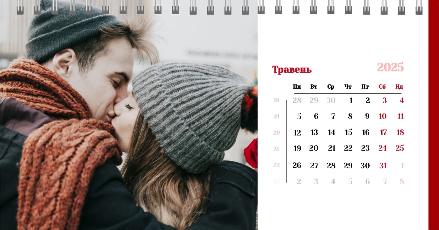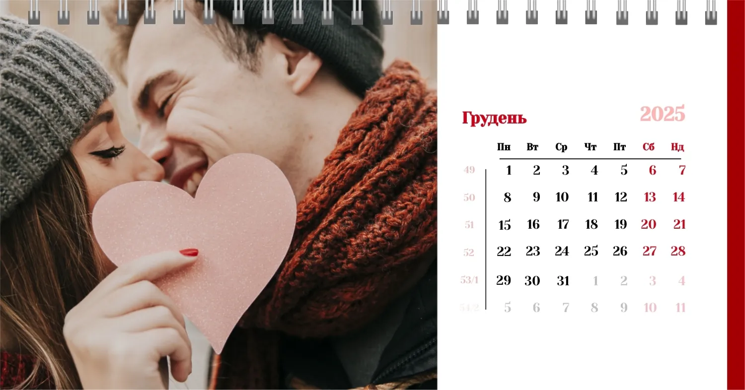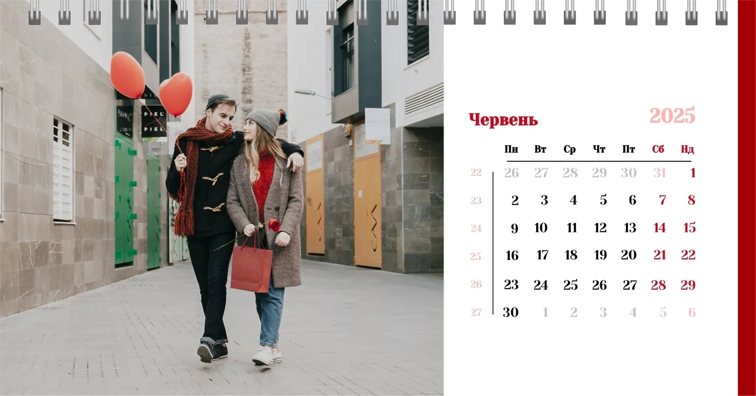 Готовий шаблон настільного календаря для закоханої пари-це ідеальний спосіб створити унікальний і зворушливий подарунок. У ньому передбачений романтичний дизайн, який підкреслює особливий зв'язок між партнерами. Такий настільний календар на 13 сторінок може стати не тільки приємним сувеніром, але і стильним елементом інтер'єру. Цей шаблон відмінно підходить для фотографів, що спеціалізуються на love story, оскільки з його допомогою можна красиво оформити професійні знімки. Головна перевага цього календаря-можливість повної персоналізації в нашому онлайн-конструкторі. Ви можете завантажувати свої фотографії, змінювати фон, додавати пам'ятні дати, романтичні підписи або навіть смішні коментарі до кожного місяця.