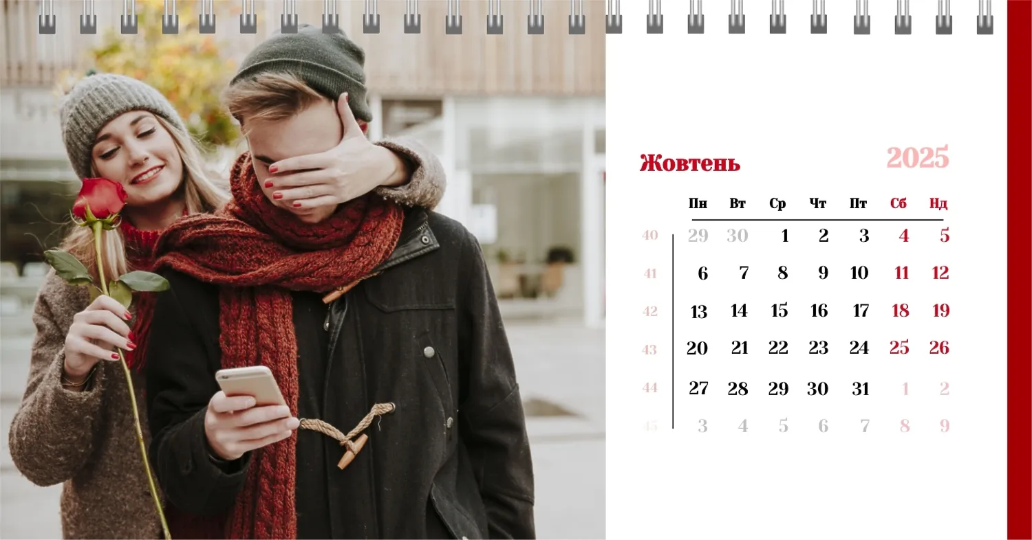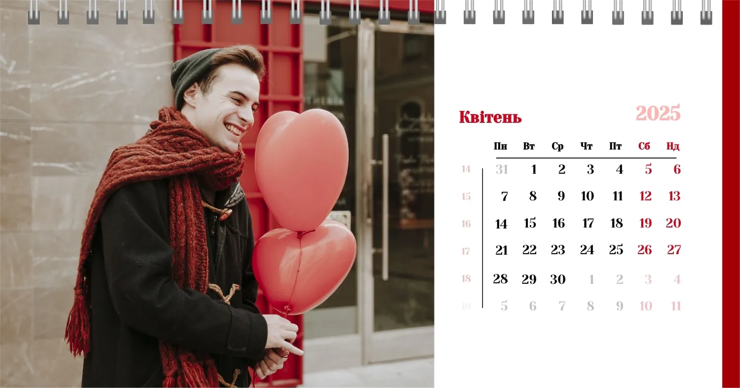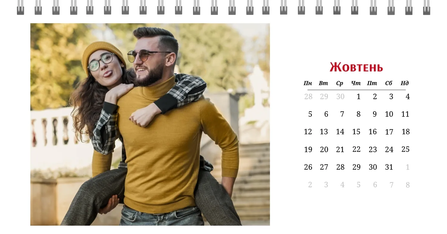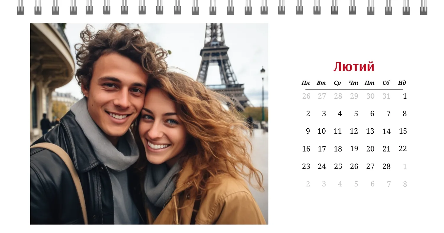 Готовий шаблон настільного календаря для закоханої пари-це ідеальний спосіб створити унікальний і зворушливий подарунок. У ньому передбачений романтичний дизайн, який підкреслює особливий зв'язок між партнерами. Такий настільний календар на 13 сторінок може стати не тільки приємним сувеніром, але і стильним елементом інтер'єру. Цей шаблон відмінно підходить для фотографів, що спеціалізуються на love story, оскільки з його допомогою можна красиво оформити професійні знімки. Головна перевага цього календаря-можливість повної персоналізації в нашому онлайн-конструкторі. Ви можете завантажувати свої фотографії, змінювати фон, додавати пам'ятні дати, романтичні підписи або навіть смішні коментарі до кожного місяця.