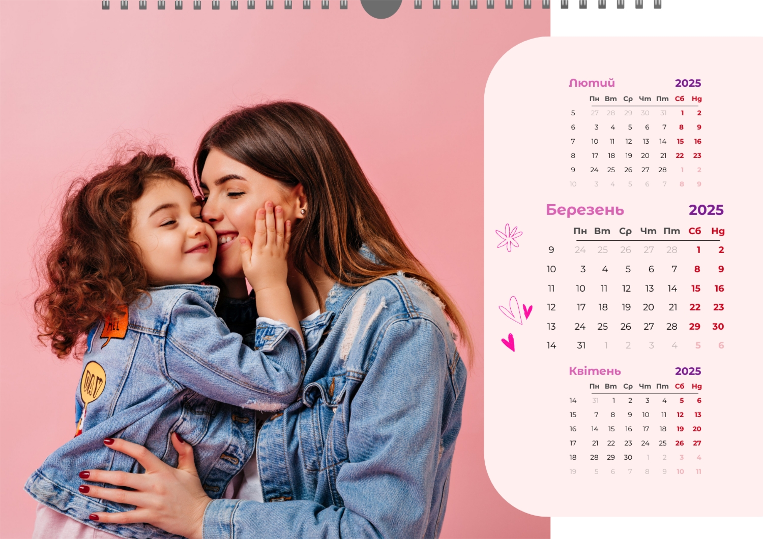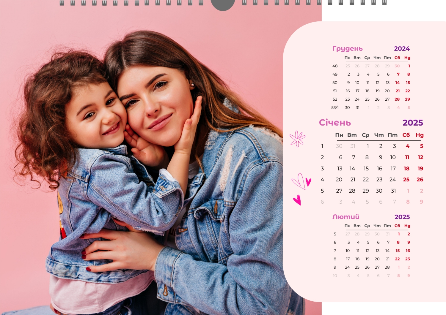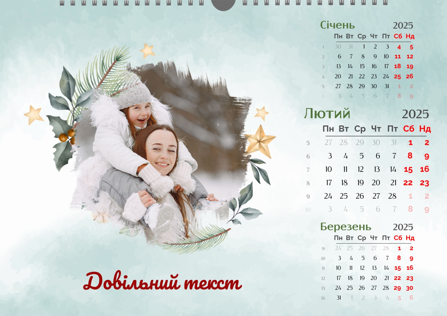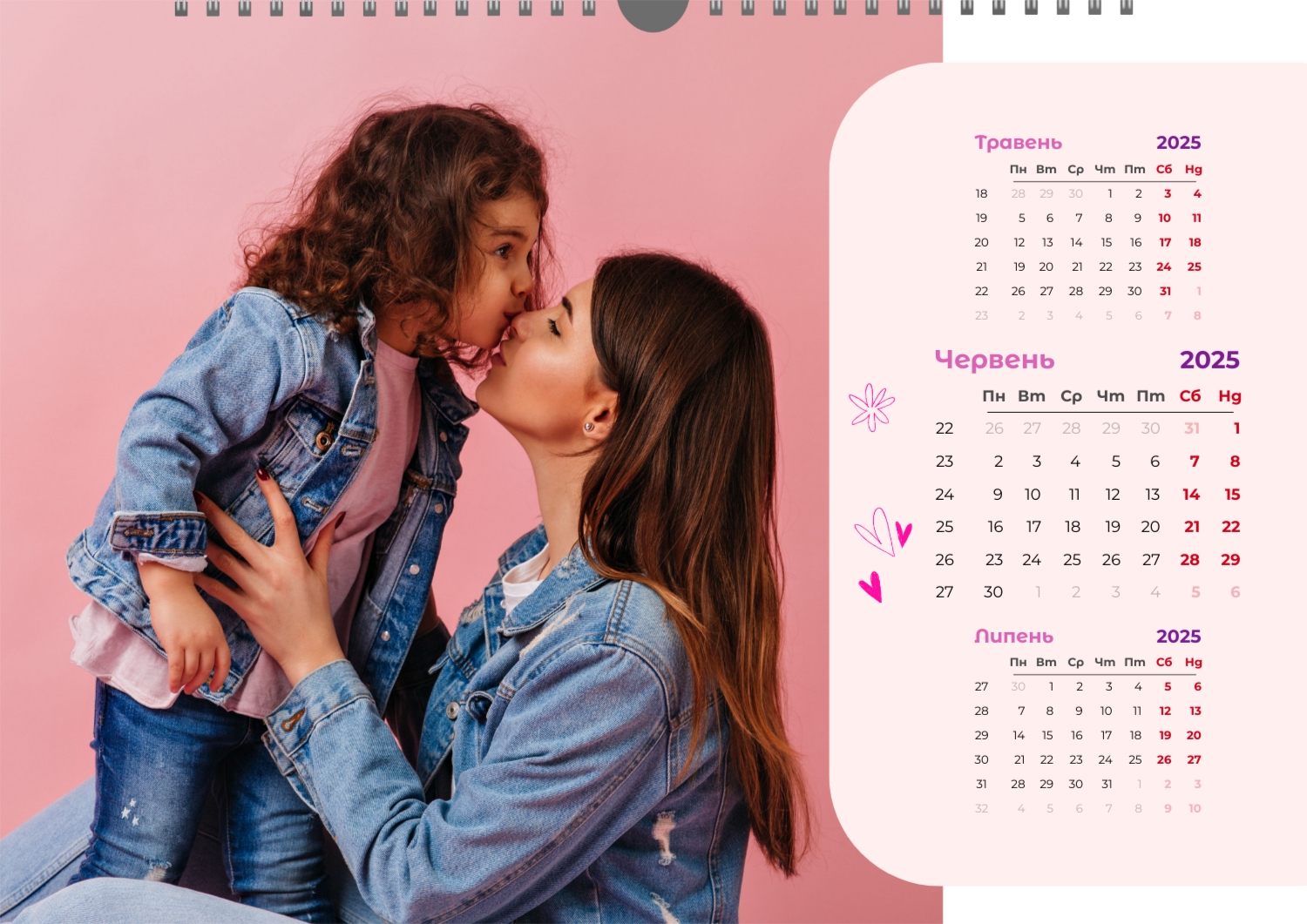 Готовий шаблон настінного горизонтального календаря для коханої мами-це зворушлива і красива основа для створення персонального подарунка, який наповнений теплом і турботою. В онлайн-конструкторі шаблон легко перетворюється в унікальний продукт. Можна вставити сімейні фотографії, вибрати улюблені моменти з життя, додати написи з теплими словами, змінити кольори і шрифти під індивідуальні переваги. Кожен місяць можна оформити в своєму стилі, вставляючи фото або побажання, пов'язані з певним часом року або важливими сімейними датами. Також доступно додавання власних свят і заміток прямо на календарну сітку. Конструктор дозволяє працювати інтуїтивно, навіть тим, хто вперше створює дизайн з нуля. Це дає повну свободу творчості і можливість створити по-справжньому унікальний настінний календар, який буде радувати маму кожен день протягом року.
