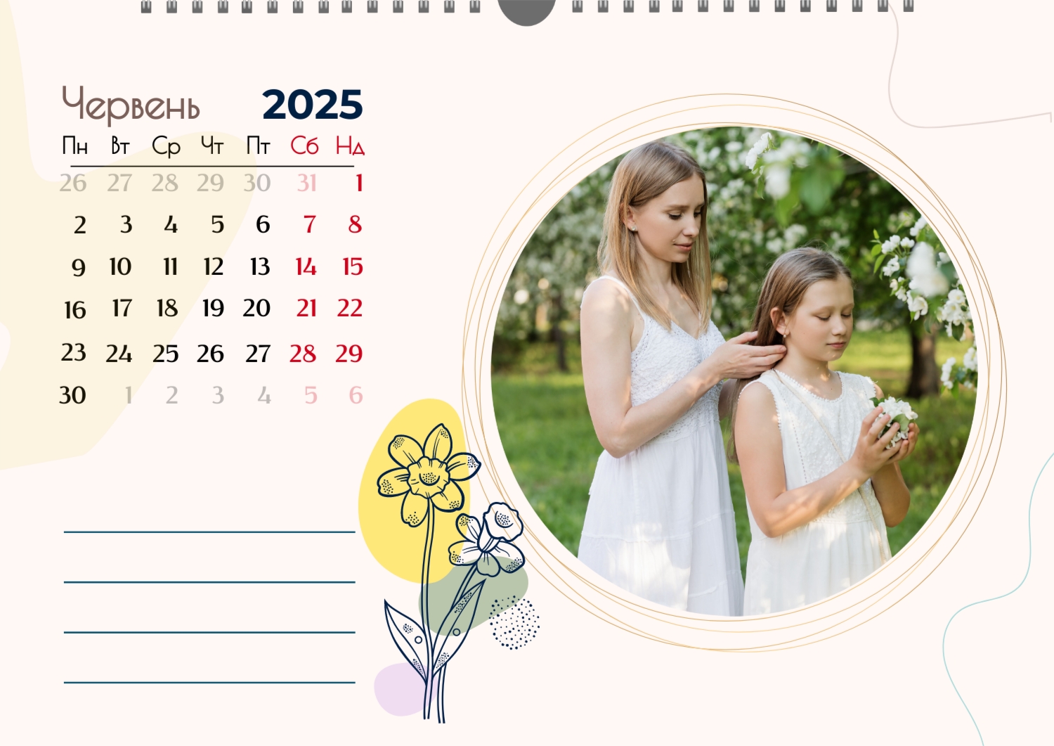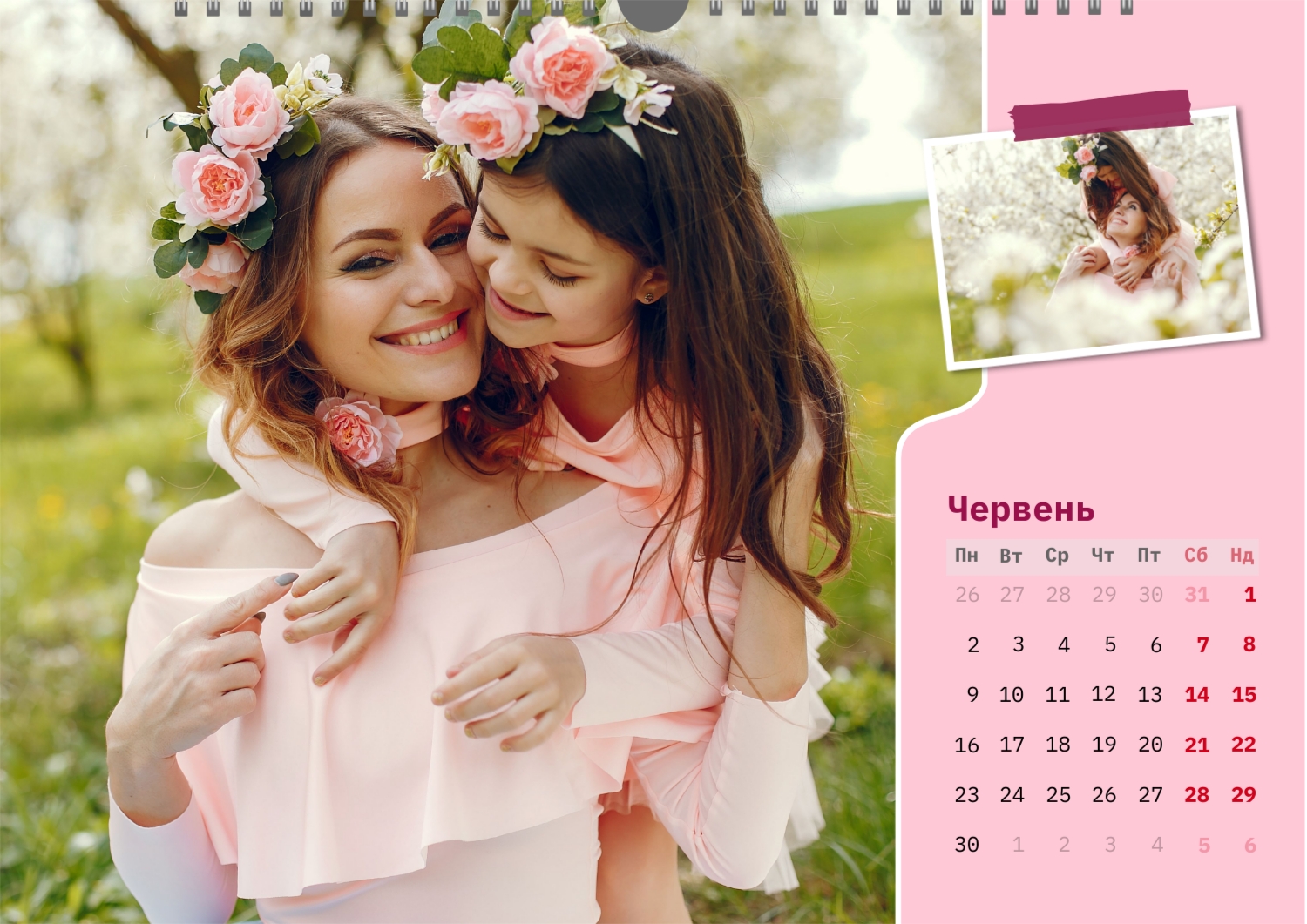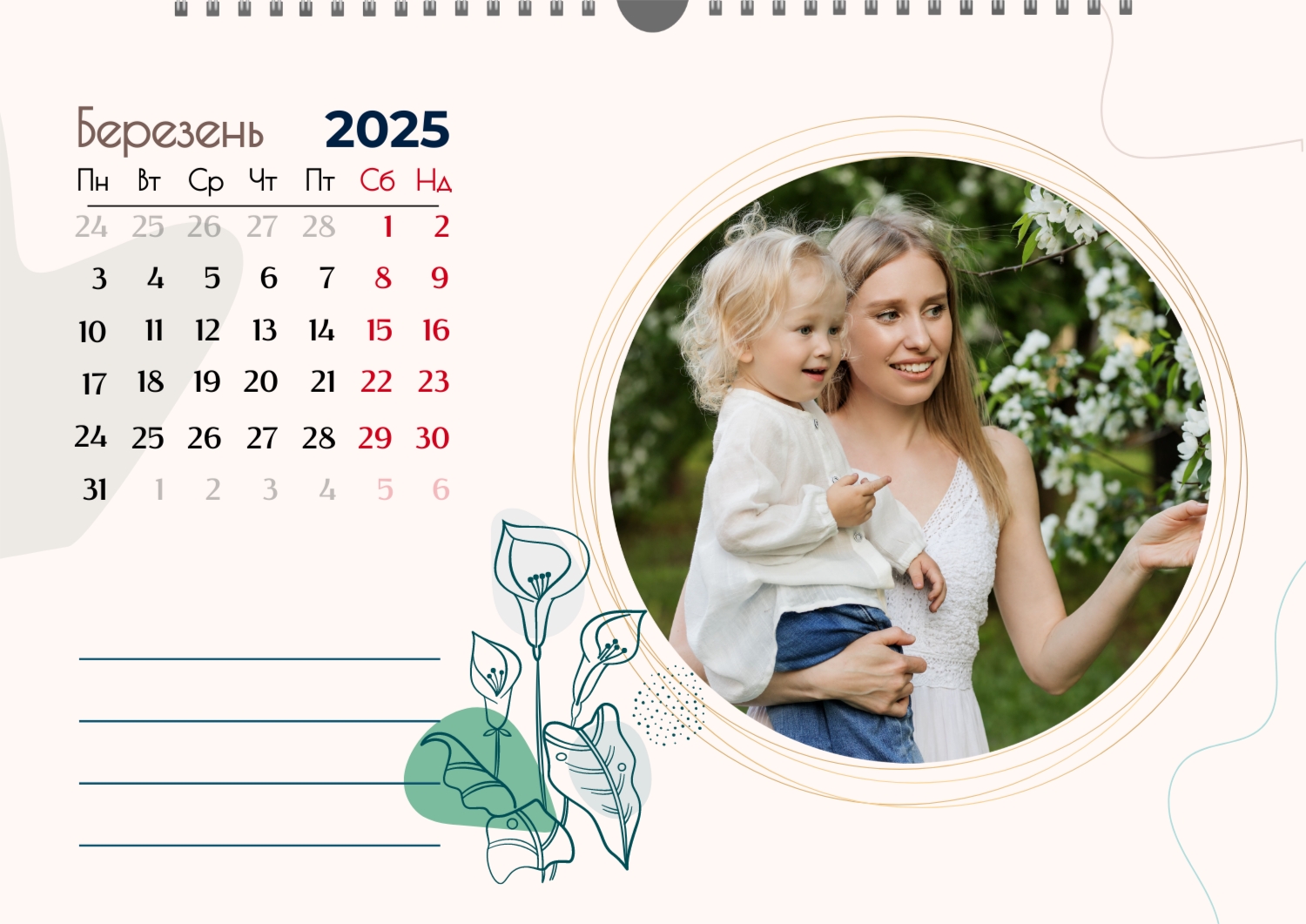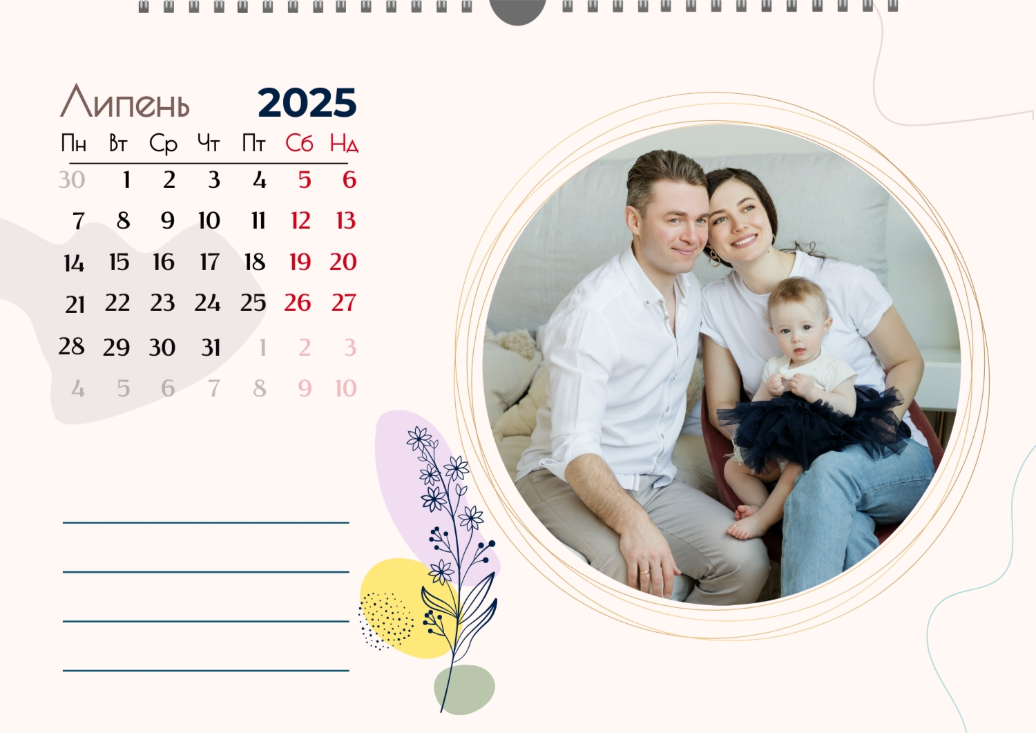 Готовий шаблон настінного горизонтального календаря для коханої мами-це зворушлива і красива основа для створення персонального подарунка, який наповнений теплом і турботою. В онлайн-конструкторі шаблон легко перетворюється в унікальний продукт. Можна вставити сімейні фотографії, вибрати улюблені моменти з життя, додати написи з теплими словами, змінити кольори і шрифти під індивідуальні переваги. Кожен місяць можна оформити в своєму стилі, вставляючи фото або побажання, пов'язані з певним часом року або важливими сімейними датами. Також доступно додавання власних свят і заміток прямо на календарну сітку. Конструктор дозволяє працювати інтуїтивно, навіть тим, хто вперше створює дизайн з нуля. Це дає повну свободу творчості і можливість створити по-справжньому унікальний настінний календар, який буде радувати маму кожен день протягом року.