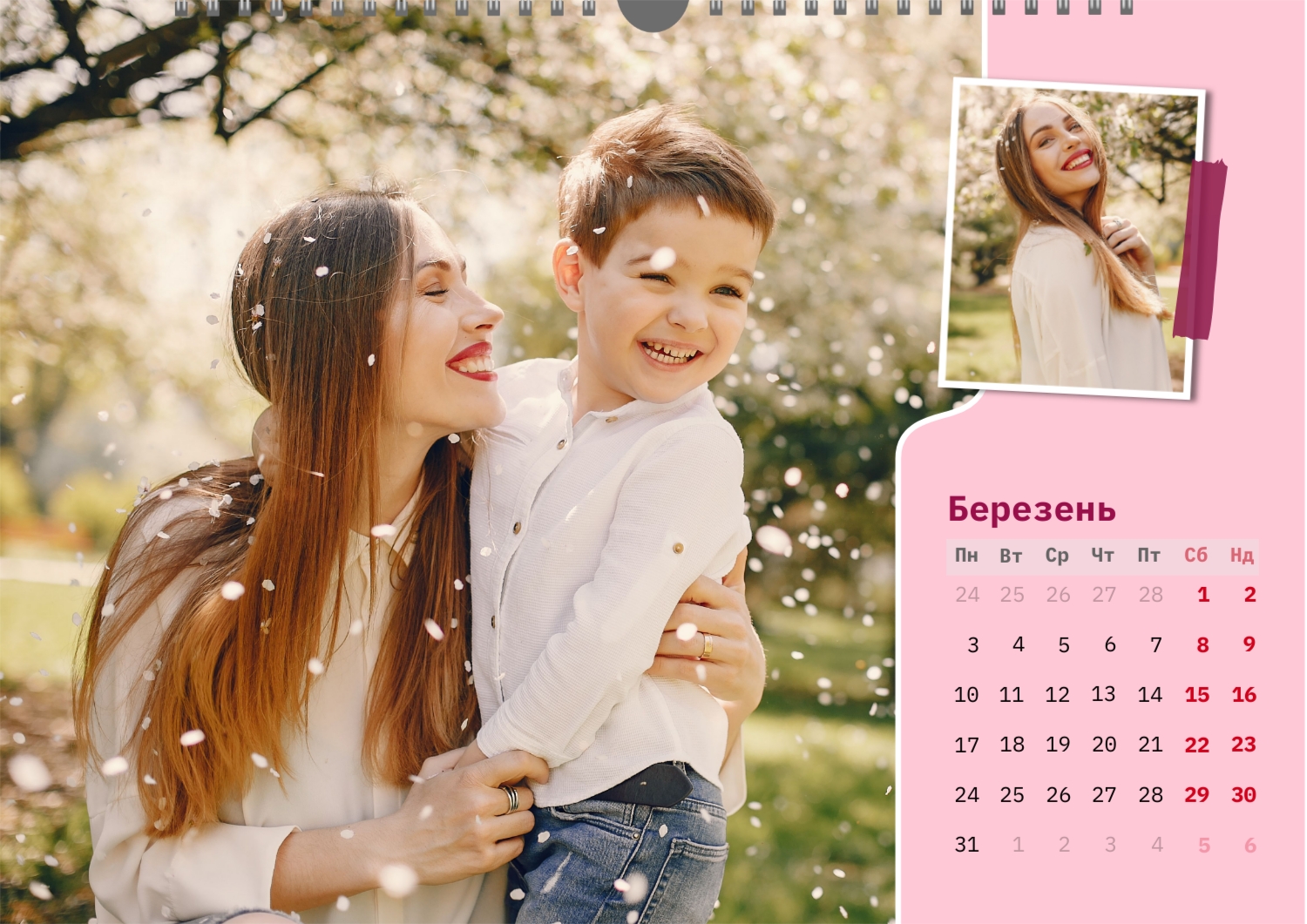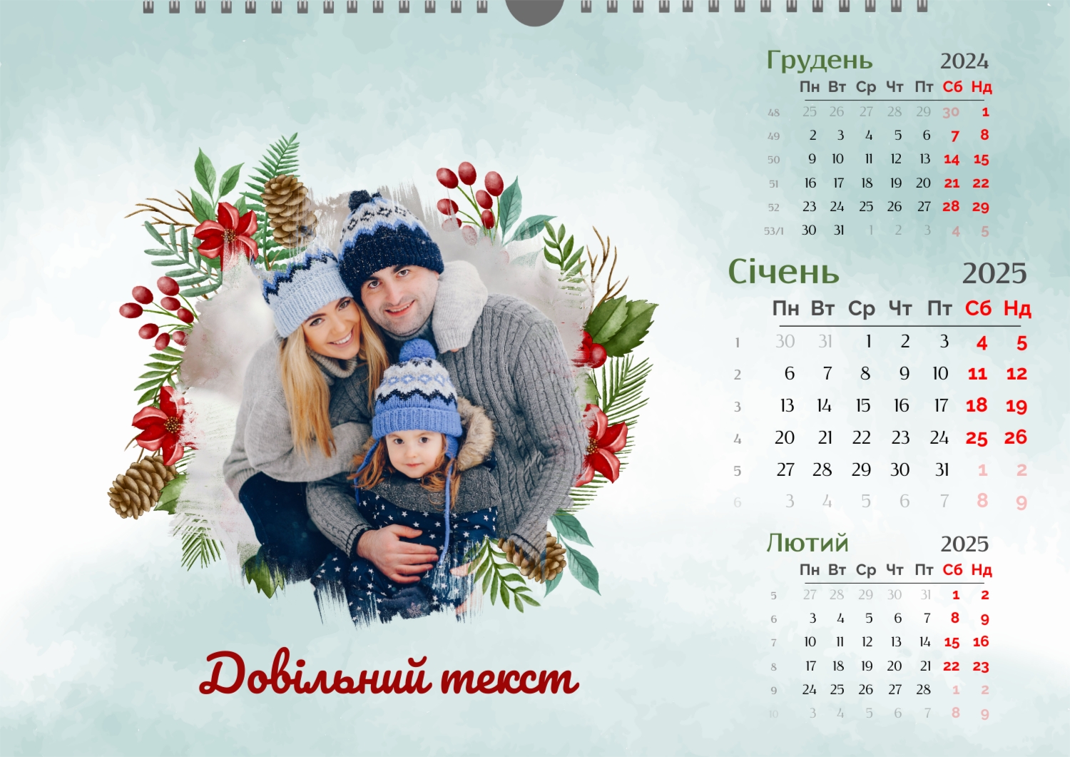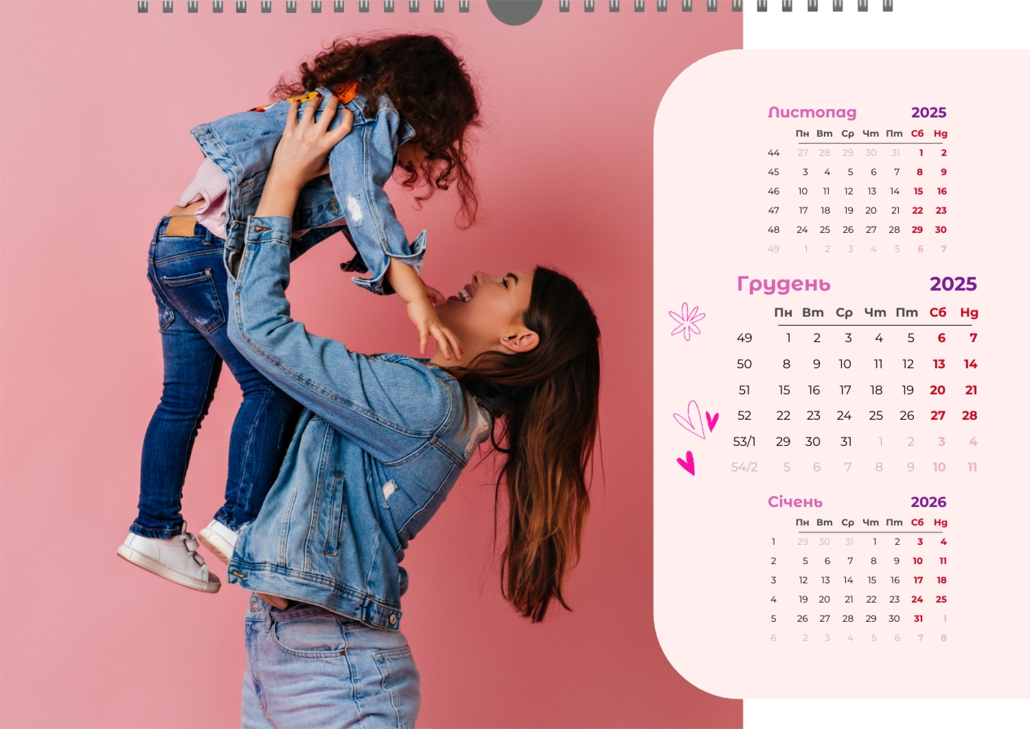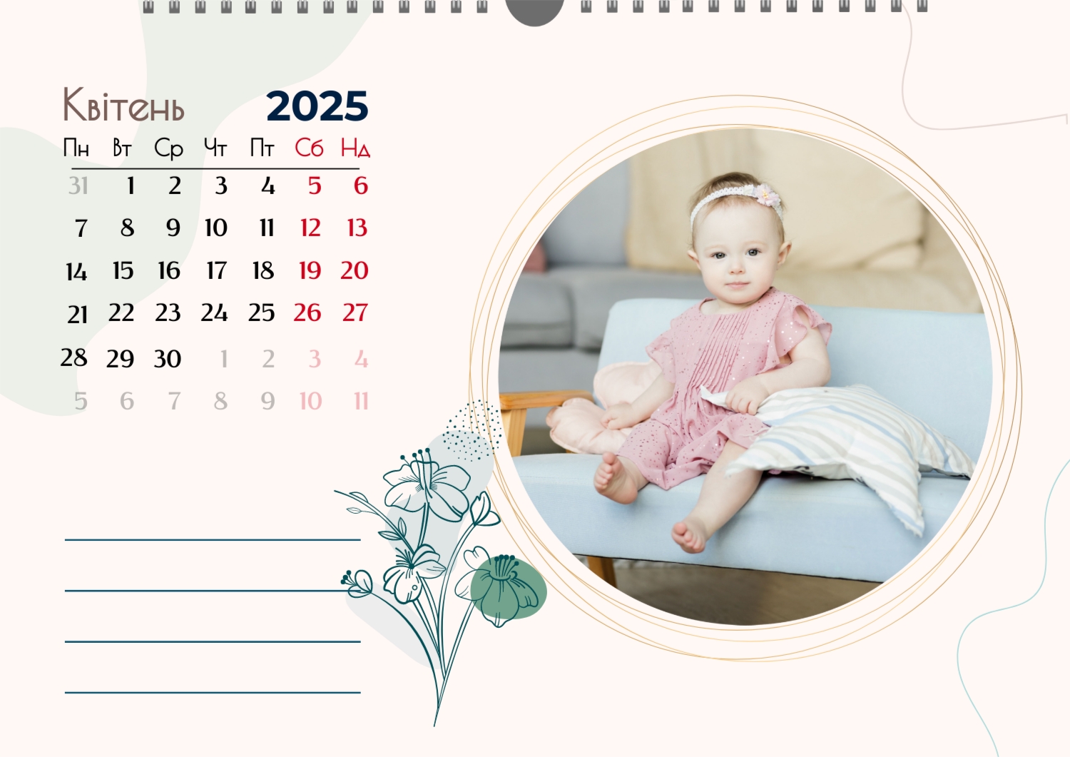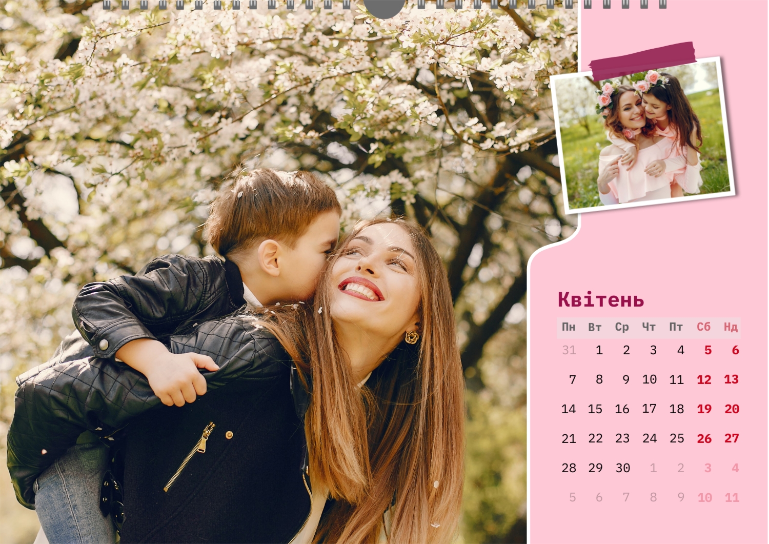 Готовий шаблон настінного горизонтального календаря для коханої мами-це зворушлива і красива основа для створення персонального подарунка, який наповнений теплом і турботою. В онлайн-конструкторі шаблон легко перетворюється в унікальний продукт. Можна вставити сімейні фотографії, вибрати улюблені моменти з життя, додати написи з теплими словами, змінити кольори і шрифти під індивідуальні переваги. Кожен місяць можна оформити в своєму стилі, вставляючи фото або побажання, пов'язані з певним часом року або важливими сімейними датами. Також доступно додавання власних свят і заміток прямо на календарну сітку. Конструктор дозволяє працювати інтуїтивно, навіть тим, хто вперше створює дизайн з нуля. Це дає повну свободу творчості і можливість створити по-справжньому унікальний настінний календар, який буде радувати маму кожен день протягом року.
