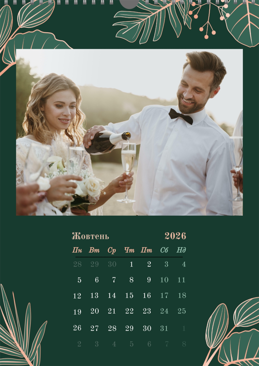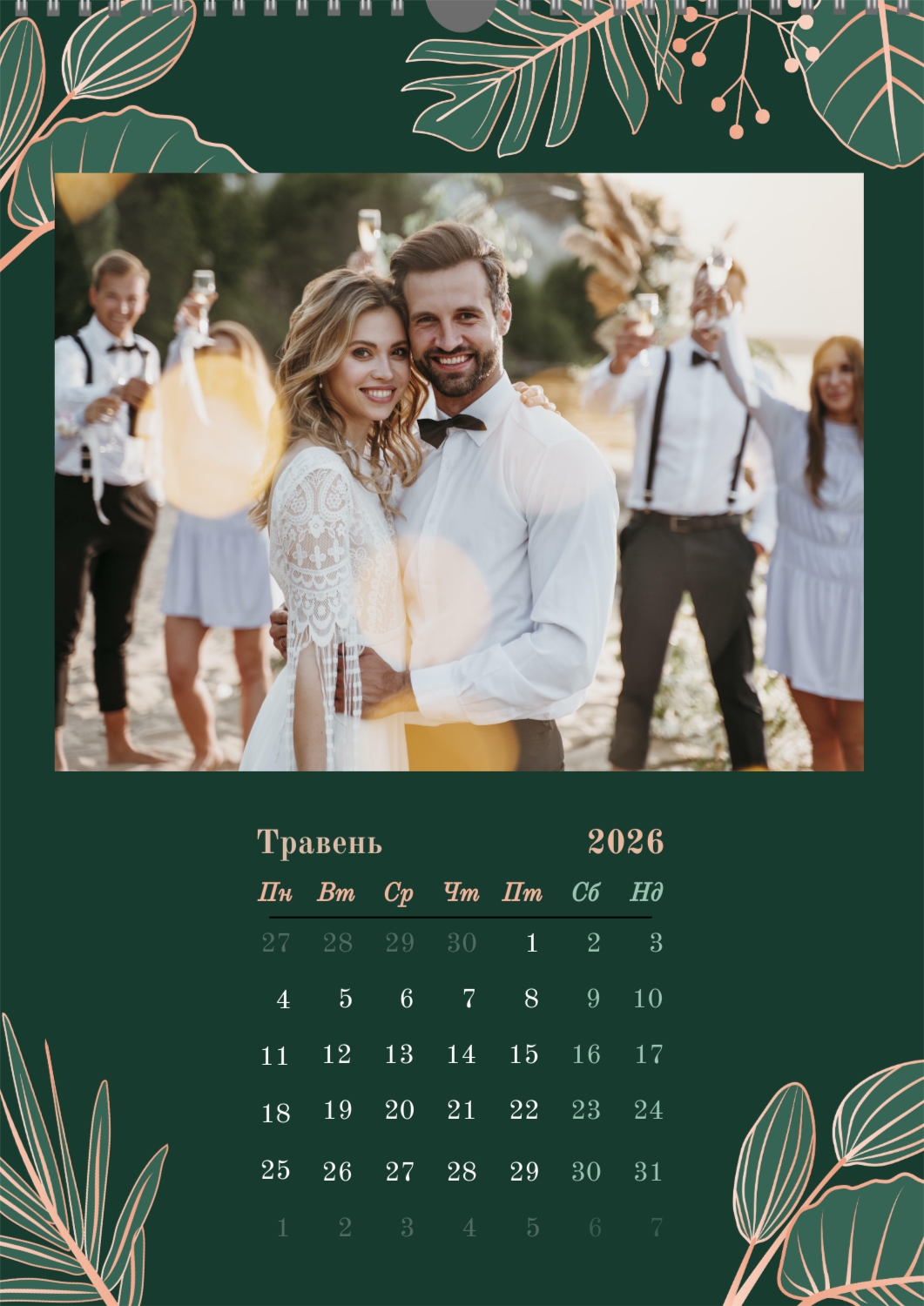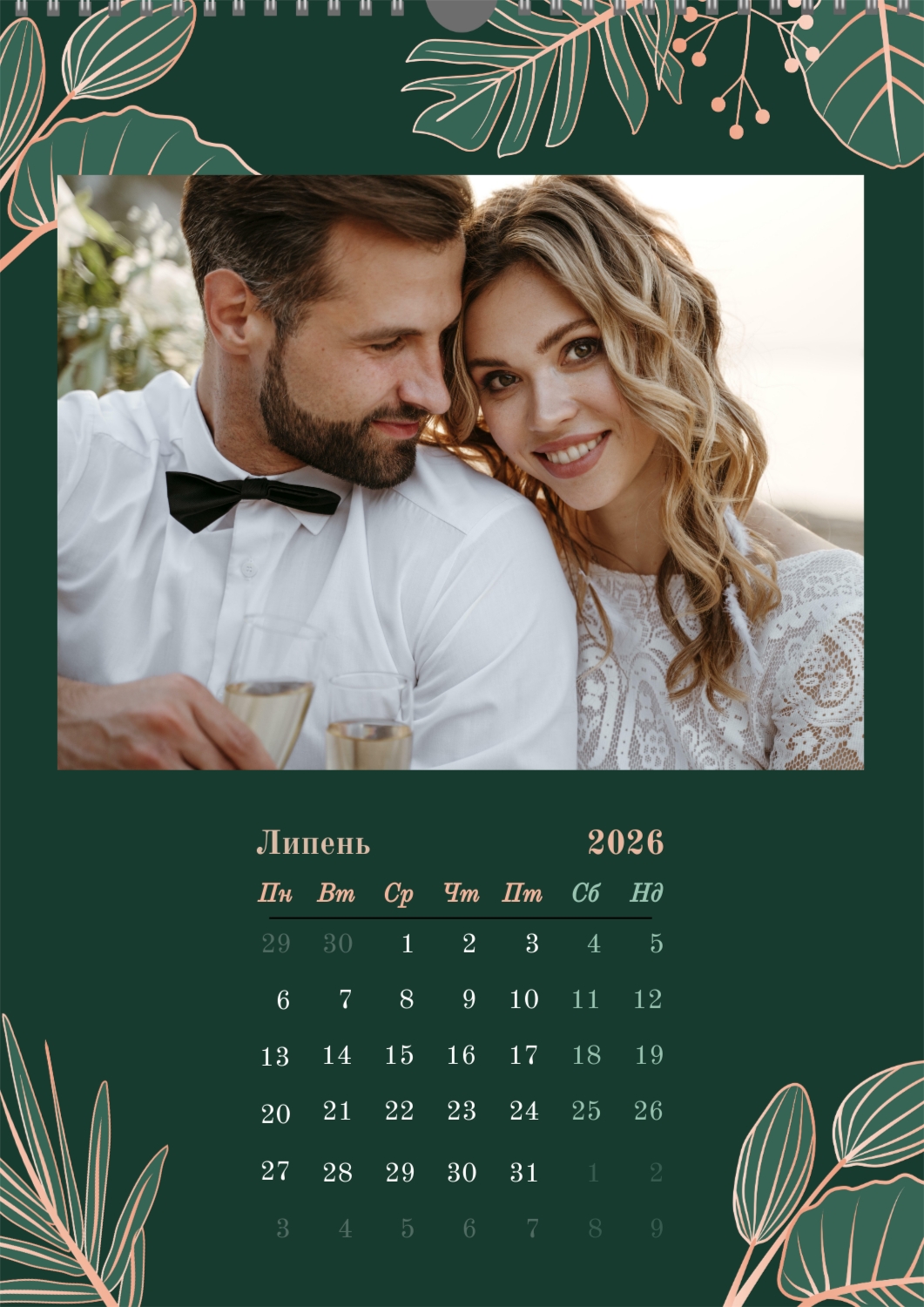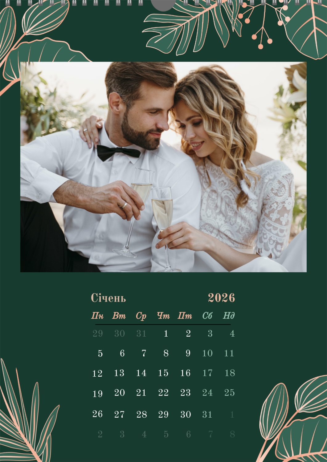Готовий шаблон настінного календаря з весільними фото-це універсальна основа, створена спеціально для тих, хто хоче зберегти атмосферу торжества в красивому і функціональному форматі. Він особливо підходить фотографам, весільним агентствам, декораторам, а також фахівцям, які створюють персоналізовані подарунки або сувеніри для молодят. Такий календар часто використовують як частину весільного пакету, як доповнення до фотокниг або як зворушливий подарунок батькам і друзям. В онлайн-конструкторі цей шаблон повністю піддається редагуванню, що дозволяє адаптувати його під будь-яку історію або стиль весілля. Можна замінити фон, змінювати розташування фотографій, коригувати колірну гамму, додавати написи, важливі дати та індивідуальні побажання. Всі елементи легко переміщаються, масштабуються і підлаштовуються під композицію — це робить процес створення максимально зручним навіть для тих, хто не має досвіду в дизайні. При необхідності можна додати декоративні елементи, фірмові шрифти або навіть стилізувати макет під певну тематику весілля, будь то класика, бохо, мінімалізм або вінтаж. Використовуючи наш онлайн-конструктор, можна створити по-справжньому унікальний настінний календар, який стане красивим нагадуванням про важливий день і буде радувати весь рік.
