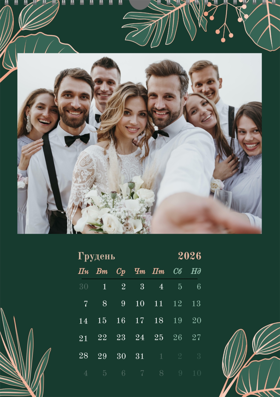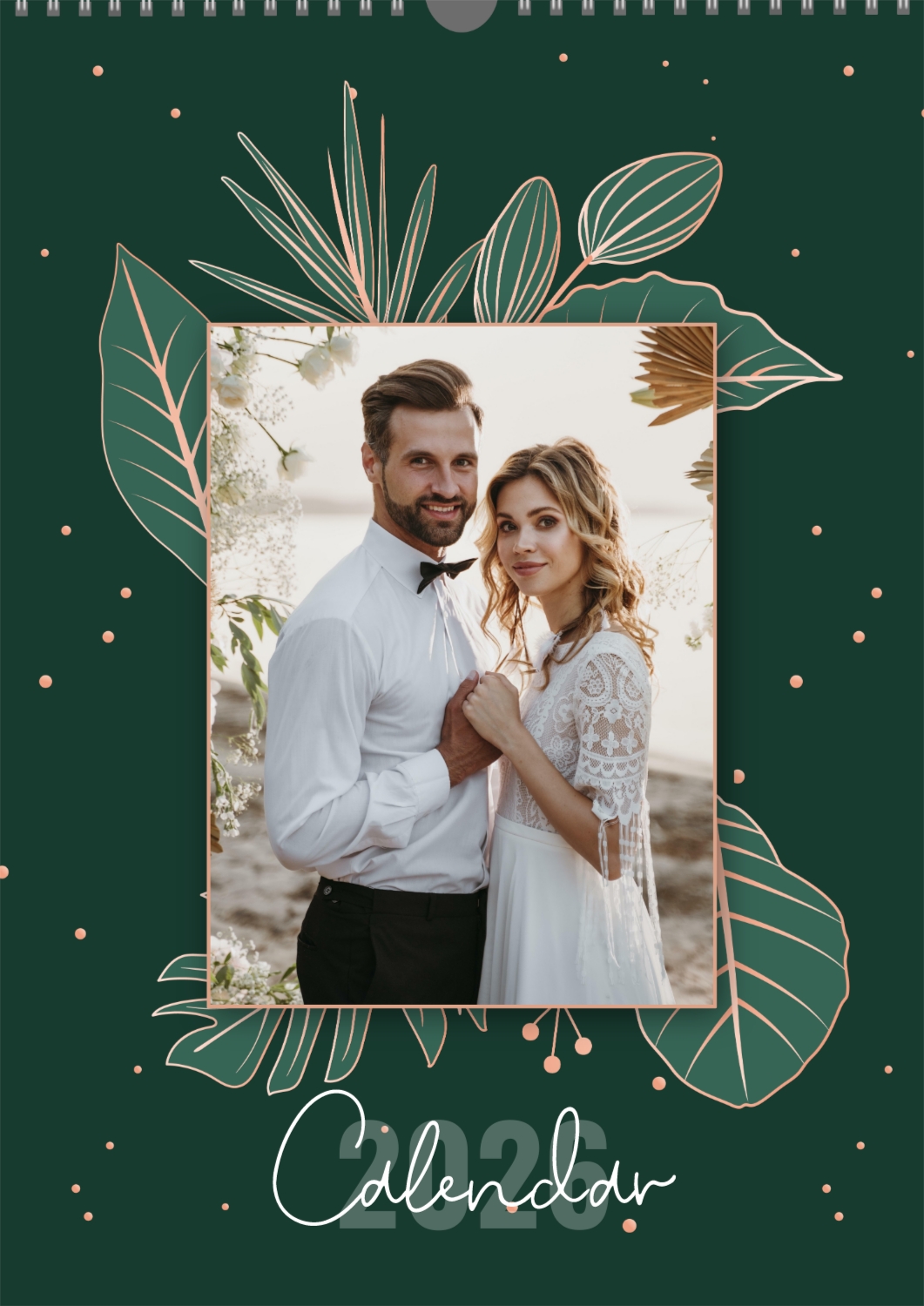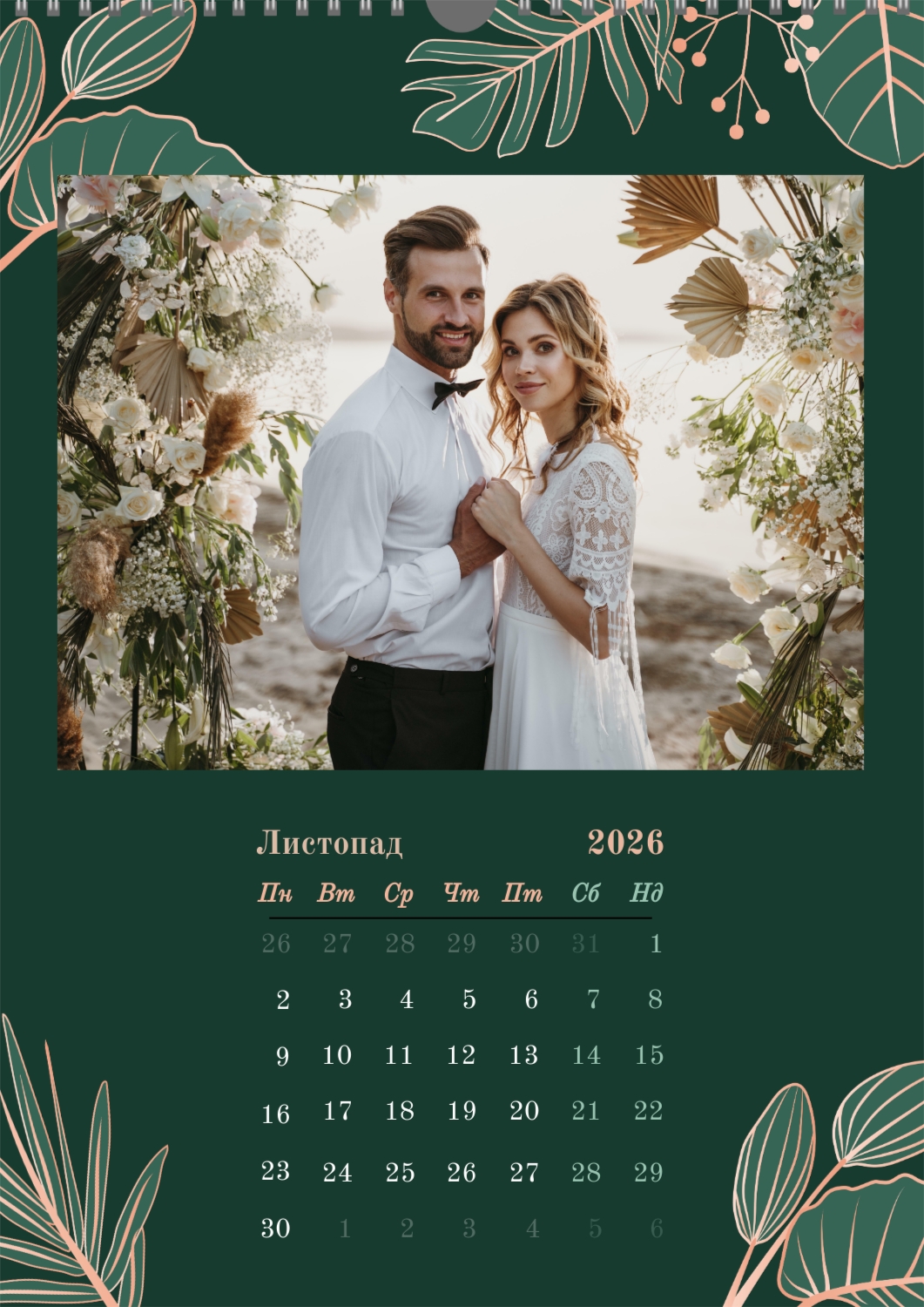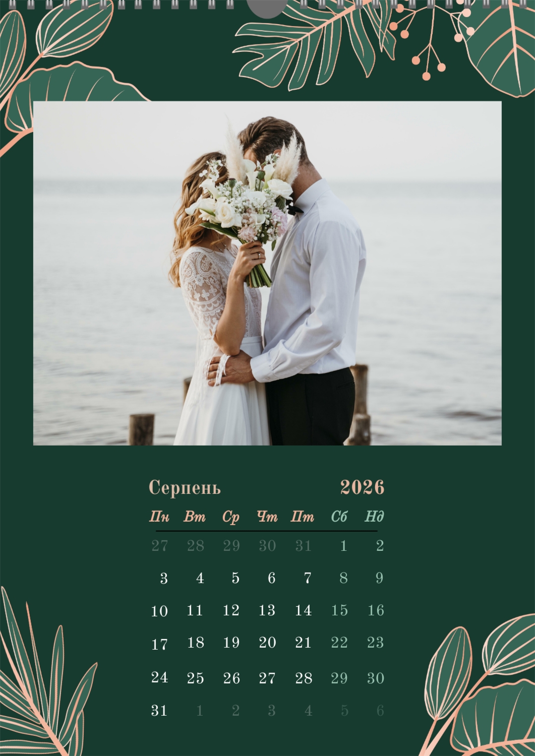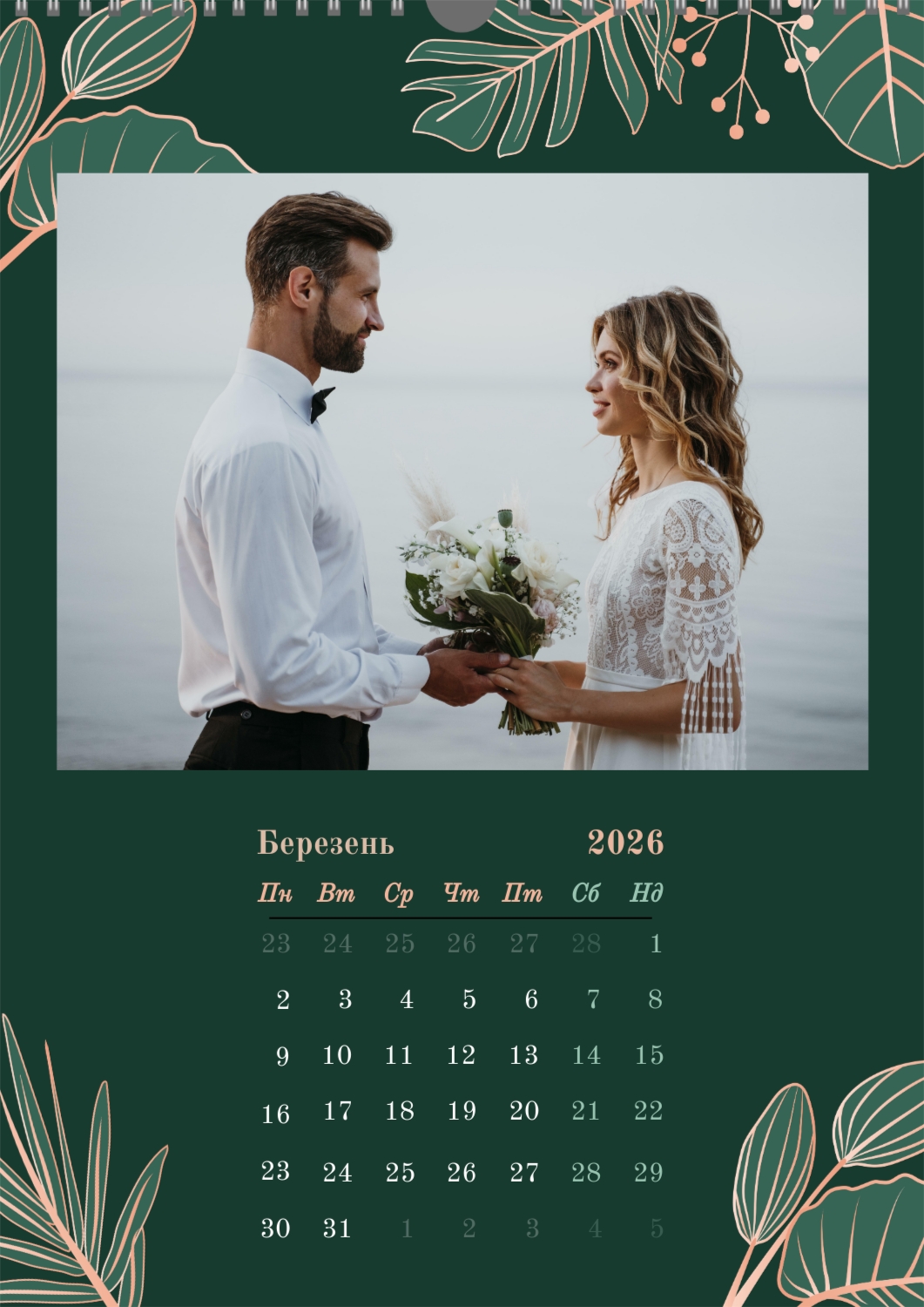 Готовий шаблон настінного календаря з весільними фото-це універсальна основа, створена спеціально для тих, хто хоче зберегти атмосферу торжества в красивому і функціональному форматі. Він особливо підходить фотографам, весільним агентствам, декораторам, а також фахівцям, які створюють персоналізовані подарунки або сувеніри для молодят. Такий календар часто використовують як частину весільного пакету, як доповнення до фотокниг або як зворушливий подарунок батькам і друзям. В онлайн-конструкторі цей шаблон повністю піддається редагуванню, що дозволяє адаптувати його під будь-яку історію або стиль весілля. Можна замінити фон, змінювати розташування фотографій, коригувати колірну гамму, додавати написи, важливі дати та індивідуальні побажання. Всі елементи легко переміщаються, масштабуються і підлаштовуються під композицію — це робить процес створення максимально зручним навіть для тих, хто не має досвіду в дизайні. При необхідності можна додати декоративні елементи, фірмові шрифти або навіть стилізувати макет під певну тематику весілля, будь то класика, бохо, мінімалізм або вінтаж. Використовуючи наш онлайн-конструктор, можна створити по-справжньому унікальний настінний календар, який стане красивим нагадуванням про важливий день і буде радувати весь рік.
